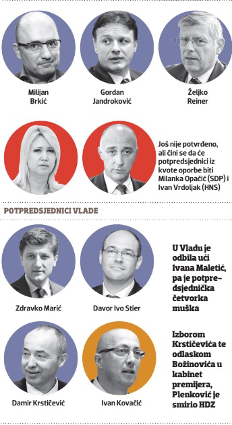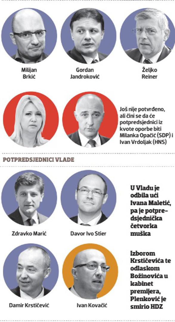 Poznata je prva HDZ-ova trojka u Vladi i Saboru. Davor Ivo Stier, Zdravko Marić i Damir Krstičević bit će potpredsjednici Vlade, a Milijan Brkić, Gordan Jandroković i Željko Reiner potpredsjednici Sabora. Predsjedništvo HDZ-a jučer je odredilo i zamjene za aktualne tehničke ministre koji će imati te funkcije do srijede, kada treba biti potvrđena nova Vlada, pa će se pojedini ministri, koji ispadnu iz igre, ponovno vratiti u Sabor, a njihove zamjene bit će tek kratkotrajne.