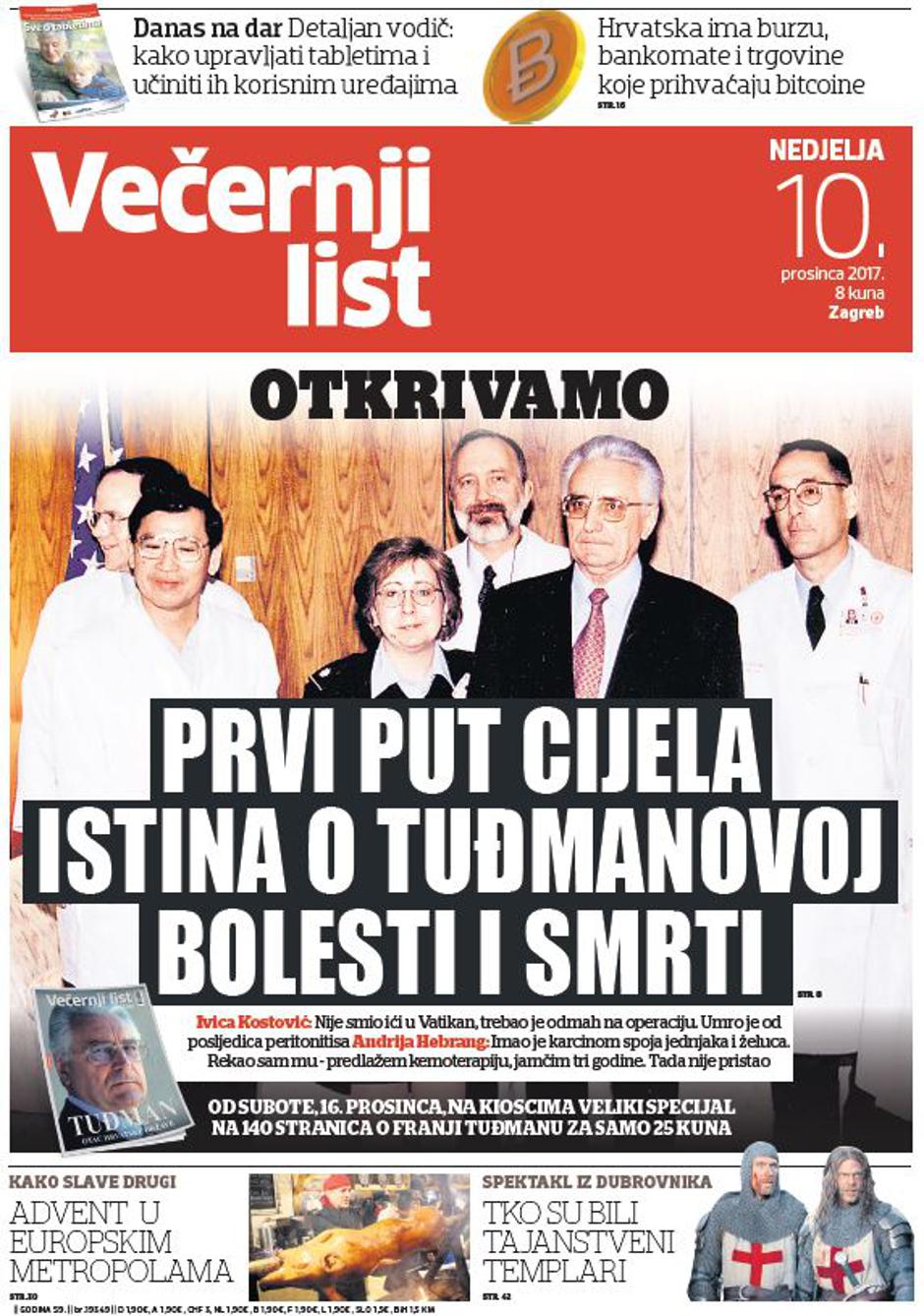 Bila je već duboka noć kad je zazvonio telefon u domu Ankice Tuđman. Odmah joj je bilo jasno da vijest nije dobra. Digla je slušalicu i začula tužan glas sina Miroslava: “Tata je umro.” “Kada?” “U 23.15. Bio sam uz njega.” Sjela je na suprugov stolac za njegovim radnim stolom, pogledala njihovu zajedničku fotografiju i počela plakati. “Suze su se slijevale niz lice. Kao da sam ih cijeli život skupljala za taj nesretni dan. Poslije četrdeset dana bolničkog liječenja izgubila sam supruga. (...) Na posljednji put, onaj bez povratka, otišao je bez mene: 10. prosinca 1999. godine ostala sam bez svojeg supruga, moja odrasla djeca bez oca, unuci bez Dide, a hrvatski narod bez čovjeka s kojim je stvorio nezavisnu samostalnu državu Hrvatsku.” Tako je gđa Ankica Tuđman u svojoj autobiografiji “Moj život s Francekom” opisala najtužnije trenutke u svom životu. Bio je to kraj agonije prvoga hrvatskog predsjednika, koji je preminuo na 7. katu Kliničke bolnice Dubrava, gdje je proveo 40 posljednjih dana svog života.