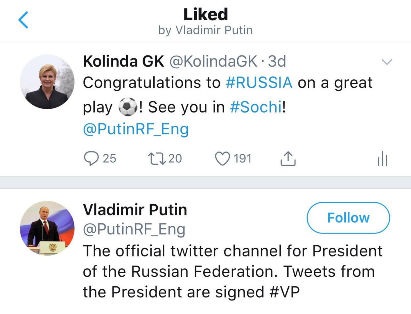 – Čestitke Rusiji na odličnoj igri. Vidimo se u Sočiju – napisala je naša predsjednica te je u svom tweetu označila i ruskog predsjednika Vladimira Putina, a on je njezinu objavu lajkao.