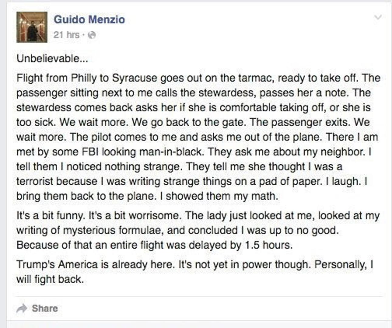 Na američkom letu iz Philadelphije u Syracuse nepoznata putnica optužila je profesora Guido Menzia (40) da je terorist, kako javlja Mashable.