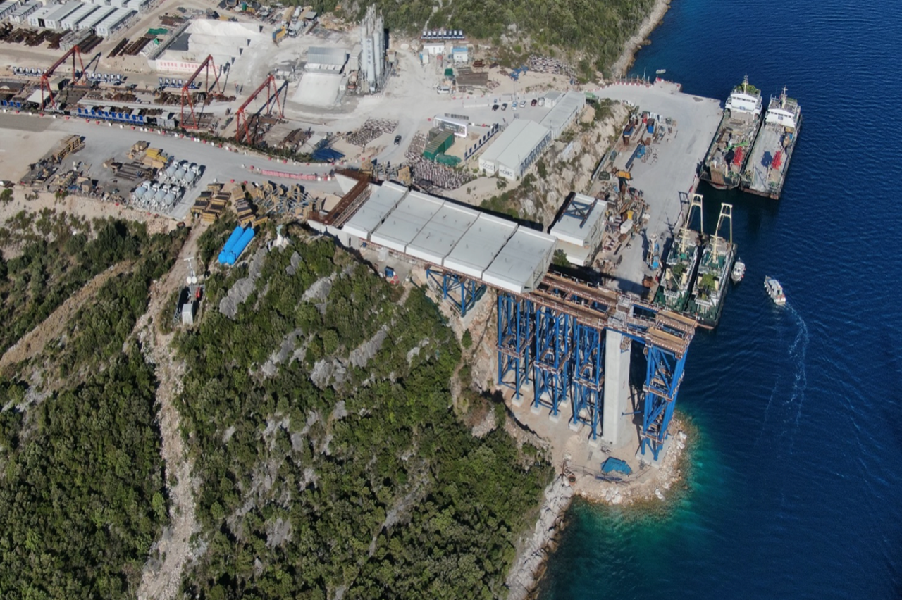 U veljači ove godine na gradilište mosta je iz pogona u Kini stiglo prvih 29 segmenata čelične rasponske konstrukcije. U kolovozu je, navode u Hrvatskim cestama, postavljeno 20 segmenata čelične rasponske konstrukcije mosta na potporne skele. Ističu i da su u drugoj polovici kolovoza na gradilište pristigli visokospecijalizirani varioci iz Kine koji rade na okrupnjavanju segmenata rasponskog sklopa. U HC-u navode da je zavarivanje dvaju segmenata počelo na pelješkoj strani mosta koji su oslonjeni na skeli uz upornjak. U Hrvatskim cestama kažu i da je na putu prema Hrvatskoj trenutačno brod s 13 novih segmenata nosive čelične konstrukcije koji bi trebao stići na gradilište početkom listopada.
