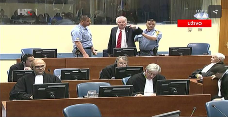 Sudsko vijeće odlučilo nastaviti s čitanjem presude. Mladić se diže, Orie mu govori da sjedne. Mladić se čuje nešto "laž". Mlatara rukama, stražari ga smiruju. Orie: izbacite ga iz sudnice