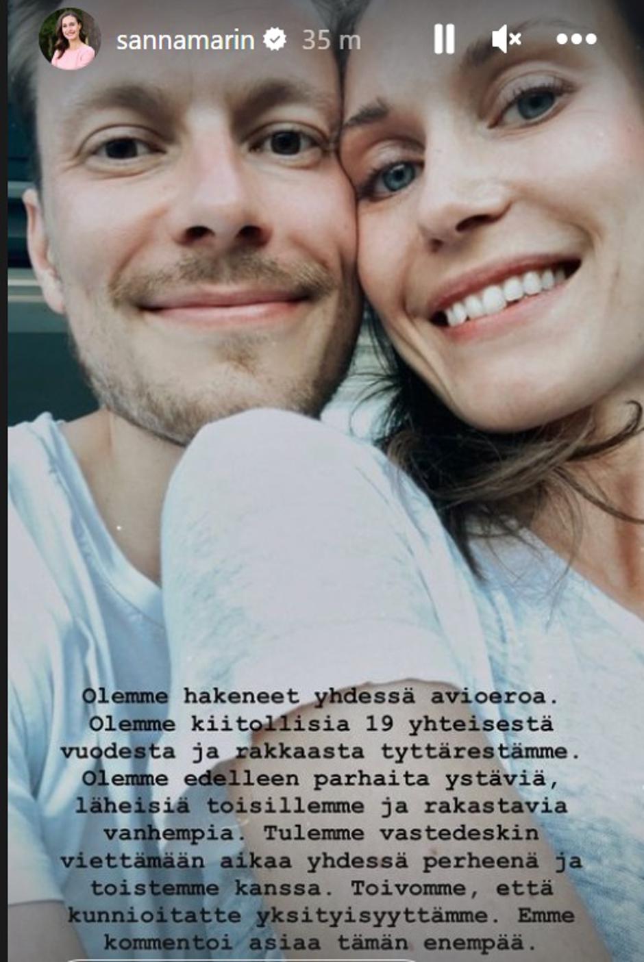 - Zajedno smo ispunili papire za razvod. Zahvalni smo na 19 godina koje smo proveli zajedno i na našoj voljenoj kćeri - napisala je finska premijerka na Instagramu gdje je objavila fotografiju sa suprugom.
