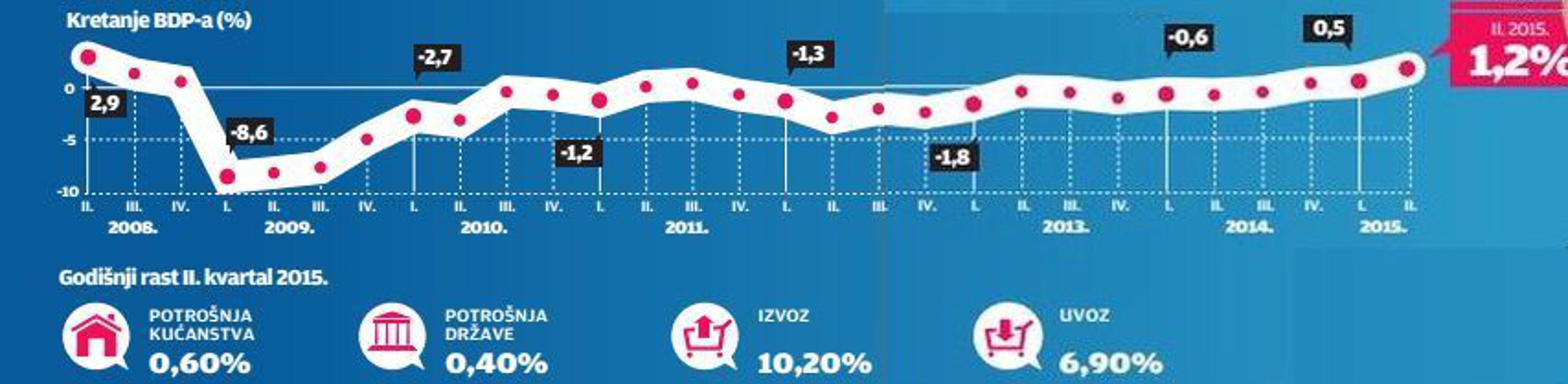 Ne treba padati u euforiju i očekivati da će se problemi prouzrokovani šestogodišnjom krizom riješiti preko noći, ali snažniji rast BDP-a sigurno je nagovještaj pozitivnijeg razdoblja u kojem ćemo konačno moći odahnuti. Raduje što su sve komponente BDP-a rasle, a država je nominalno trošila gotovo jednako novca kao i lani. Nije bilo smanjenja javne potrošnje, što je potrebno da bi se obračunalo s buktajućim javnim dugom, ali nije bilo ni povećanja. Osobna potrošnja rasla je jače, i to prije svega zbog poreznih rasterećenja dohodaka radi kojih se građanima srednje platežne moći oslobodio dodatni iznos novca za trošenje. Izvoz je ipak najzaslužniji za oporavak jer je jedina komponenta koja je napravila ozbiljan iskorak, rastao je više od 10 posto. Uvoz nije pratio ritam izvoza. Treba napomenuti da ove godine u drugom tromjesečju nije bilo uskrsne potrošnje, koja je nabildala podatke za prvo tromjesečje, pa je realan rast potrošnje i veći nego što to podaci pokazuju.