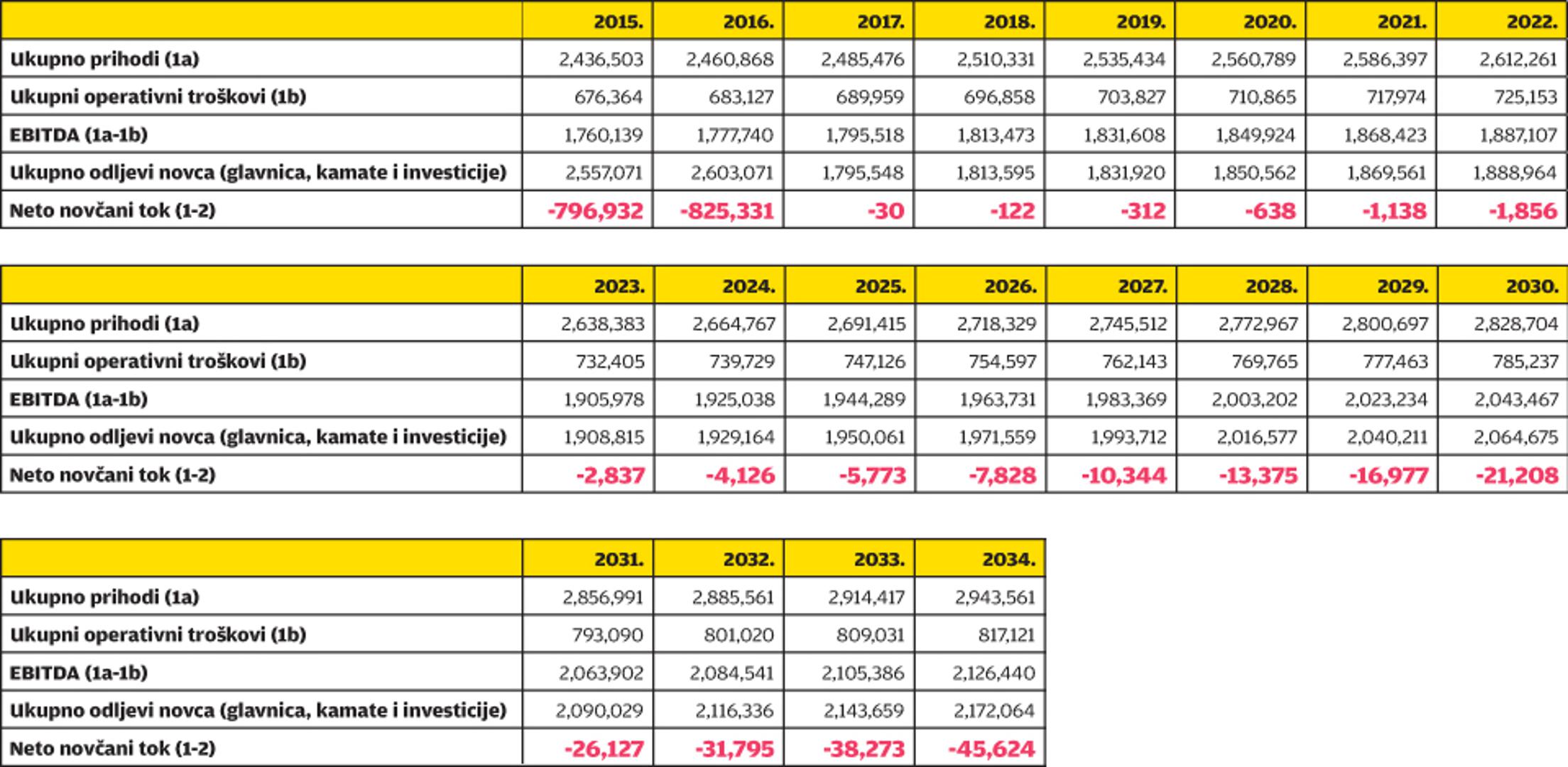 Na kraju, pretpostavljeno je zaduživanje uz prosječnu kamatnu stopu od 4,5 posto – kamatu koju je dobio HAC ove godine – tijekom cijelog trajanja kredita. Riječ je o vrlo optimističnom scenariju, no i u takvim okolnostima operativni novčani tok kompanija takav je da teško može pokrivati anuitetne rate. Kada bi tijekom dvadesetogodišnje otplate kredita HAC i ARZ svih godina otplaćivali ravnomjerne rate kamata i glavnice, čak i u najuspješnijim godinama imali bi minus od 300-tinjak, a u lošijima i do 800 milijuna kuna. Takav način otplate u 20 godina rezultirao bi minusom od novih 11 milijardi kuna koje bi se trebale pokriti novim zaduženjem.