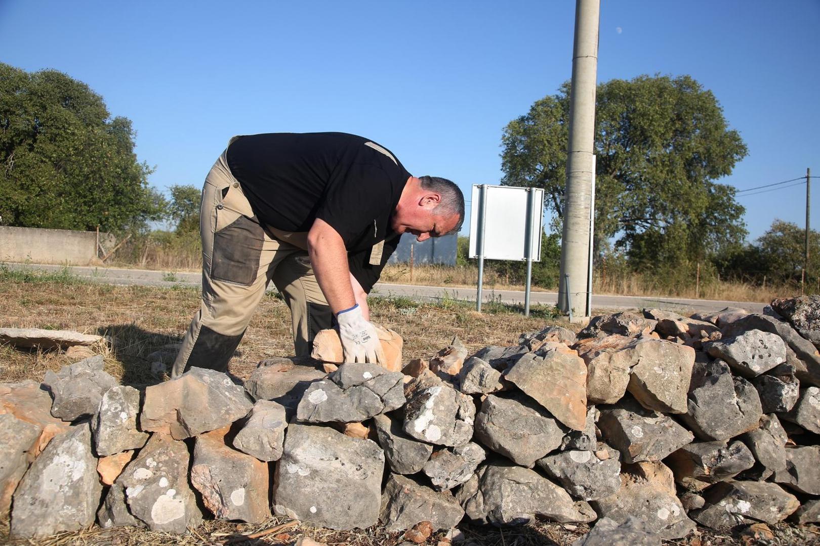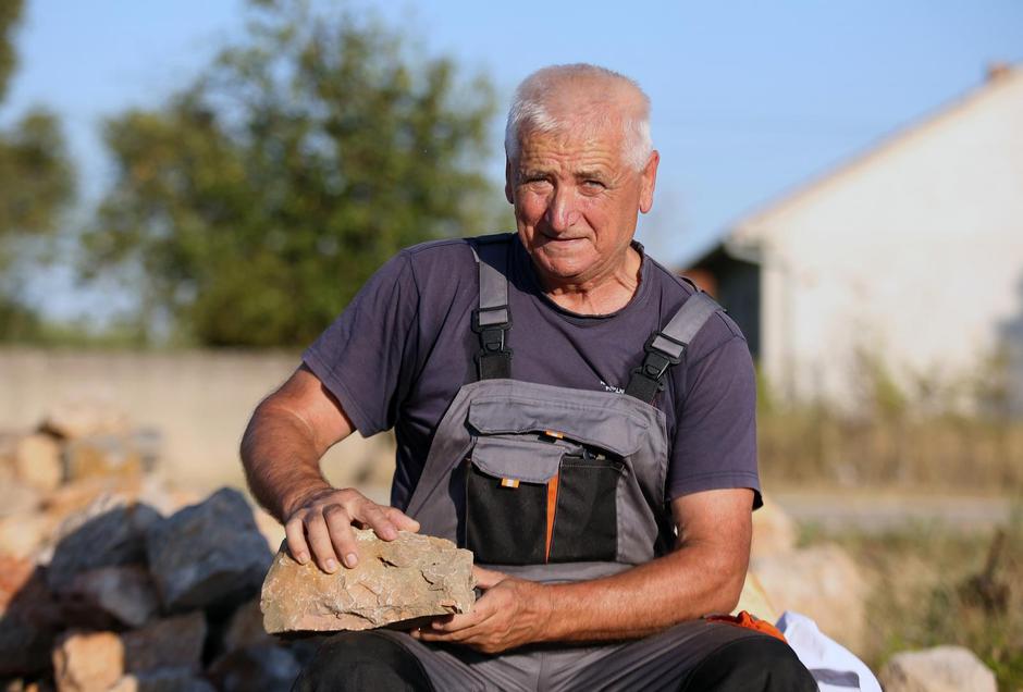 Gradili smo duplicu, kako se naziva dvostruki zid koji ima dva lica, za razliku od gradnje “unjulo” kakva, primjerice, prevladava na Kornatima, a naročito smo vodili računa o onoj strani koja gleda prema glavnoj županijskoj cesti pokraj koje smo radili, s koje će se vidjeti naših ruku djelo i kojom ćemo, kako smo to često ponavljali, ubuduće svi mi ponosno prolaziti i pokazivati kamenje premješteno i složeno našim rukama. Između dva reda većeg kamenja, koje se mora slagati pod blagim nagibom prema unutra, nasipa se škalja, sitno kamenje koje je jednako važno kao vezivno tkivo koje učvršćuje i drži zid. Ja sam radio uz meštra Rajka i odmah zapamtio njegovu glavnu pouku: svaki kamen ima svoje mjesto. Prevrneš ga jednom, dvaput, triput i, ako dobro ne sjedne, odbaciš ga na stranu, siguran da će se dva-tri metra dalje dobro uklopiti.