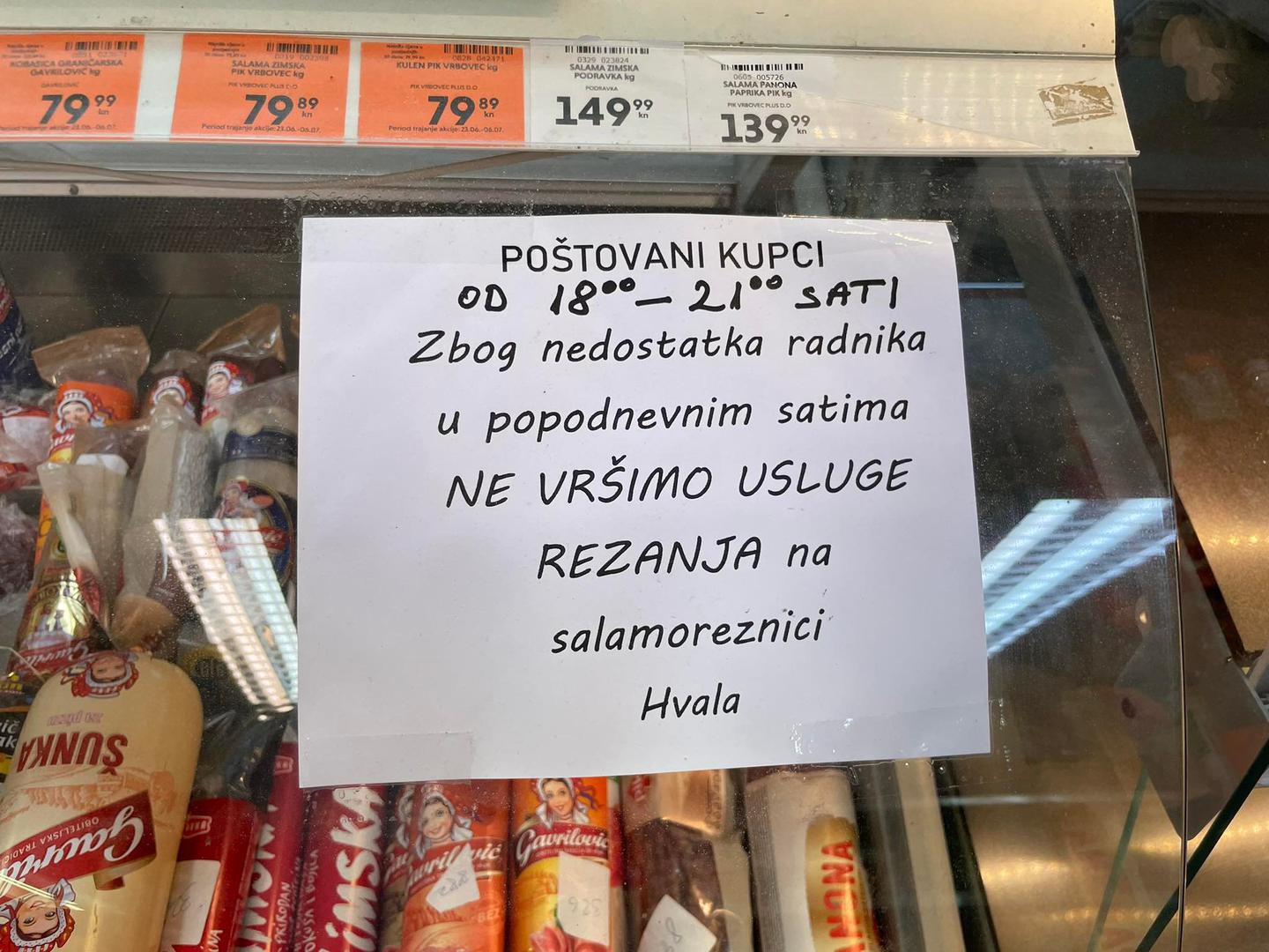 ''Poštovani kupci, od 18 do 21 sati zbog nedostatka radnika u popodnevnim satima ne vršimo usluge rezanja na salamoreznici. Hvala'', stoji u poruci kupcima na odjelu,