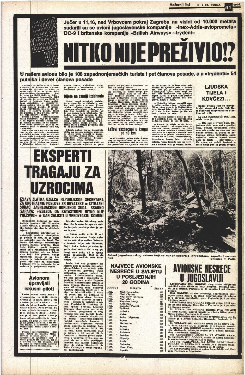 Najteža avionska nesreća u povijesti bivše države, ali i jedna od tada najtežih i najsmrtonosnijih u svijetu, unazad 20 godina, dogodila se u Hrvatskoj, 10. rujna, 1976. godine. Tog crnog petka, na nebu iznad Vrbovca, desila se tragedija kakva se vrlo rijetko događa u zrakoplovnom prometu – na visini od 10 000 metara izravno su se sudarila dva aviona, jugoslavenski DC-9 'Inex-Adria-avioprometa' i avion Hawker Siddeley Trident 3B, kompanije 'British Airways'. Tragediju, čije potresne prizore i danas pamte stanovnici tog kraja, nitko od 176 putnika i članova posade nije preživio.