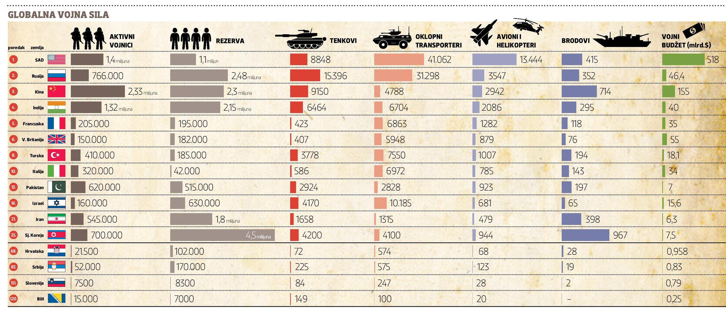Naši istočni susjedi, Srbija nalaze se na 83. mjestu. Imaju dvostruko više aktivnih vojnika od nas, 52 tisuće, dok im rezerva broji oko 170 tisuća pripadnika. Po oklopnjacima su također brojniji, u njihovu je arsenalu 225 tenkova, 575 borbenih oklopnih vozila, 72 samohodne haubice kao i 144 artiljerijska oružja te 82 višecijevna lansera.