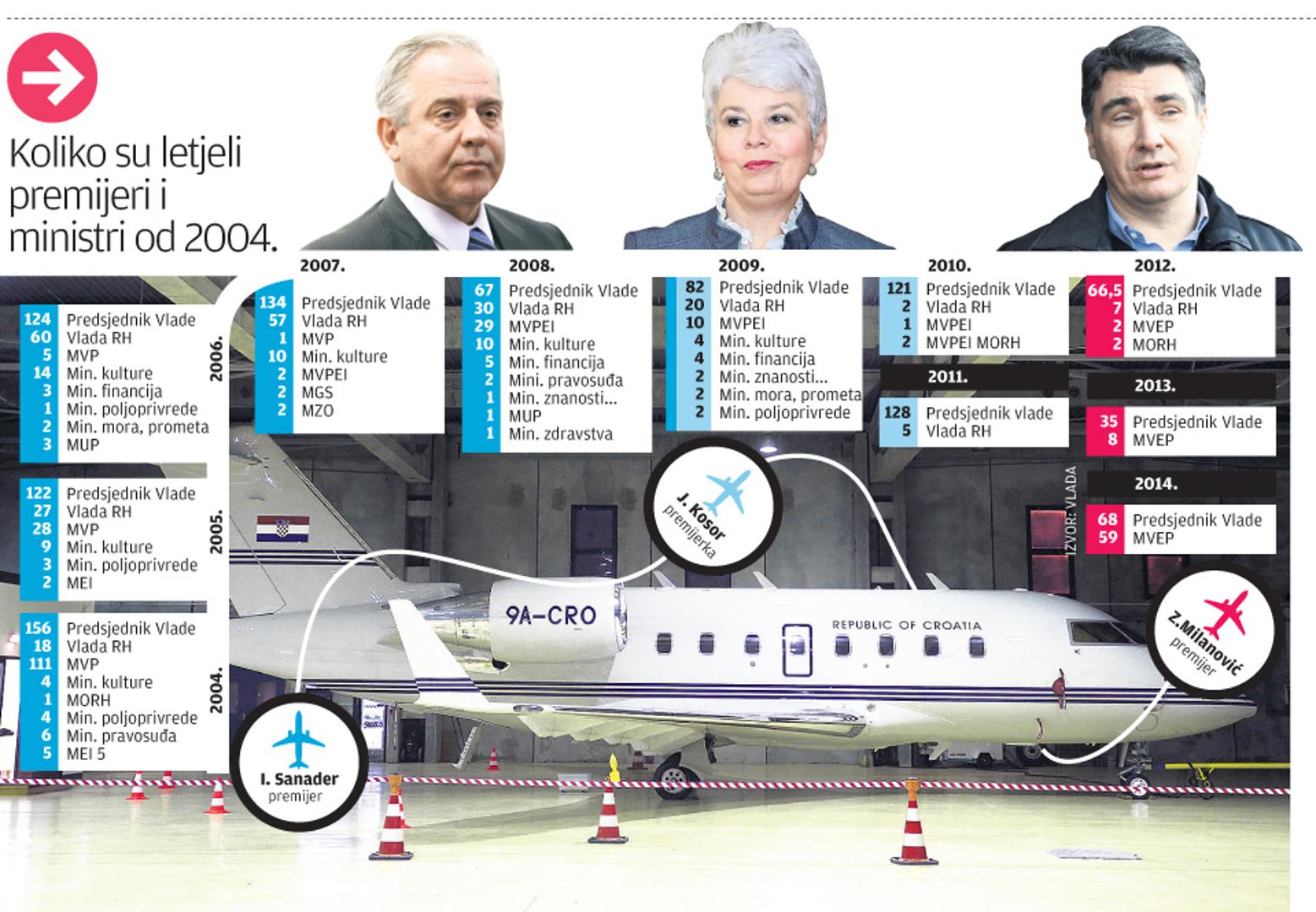 Iz službenih podataka o korištenju Vladina zrakoplova koje smo dobili iz Vlade jasno je kako se uvjerljivo najviše letjelo u prvom Sanaderovu mandatu – 916 puta, a premijer Ivo Sanader je rekorder i po tome što je on osobno najviše letio Vladinim zrakoplovom – čak 603 puta u pet godina. Jadranka Kosor kao premijerka tijekom 2010. i 2011. godine letjela je 249 puta, a Zoran Milanović u svoje tri godine na čelu Vlade službeni zrakoplov koristio je 169 puta – znatno manje od svojih prethodnika.
