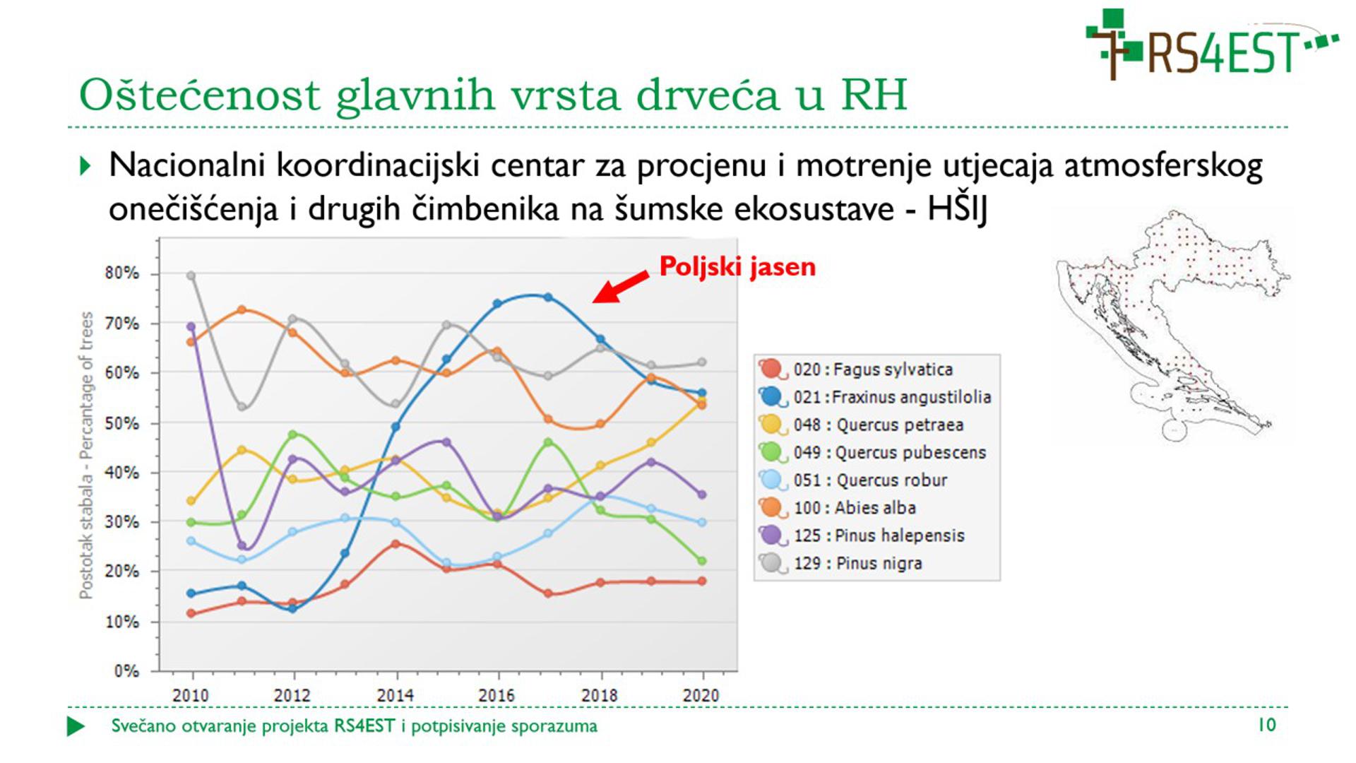 Ukupna površina šuma i šumskih zemljišta u Republici Hrvatskoj iznosi 2,759.039 ha, što čini 49,3% kopnene površine države, po čemu se nalazi u skupini šumovitih europskih zemalja. Praćenje zdravstvenog stanja šuma, a naročito intenziteta i dinamike oštećenosti stabala, neophodna je aktivnost u gospodarenju šumama. „Ovo je izniman projekt za Hrvatsku koji je spojio struku i znanost. Možda naši građani nisu ni svjesni koliko je ovo važno, no naša zajednička suradnja i suradnja s ESA-om potvrđuje tu činjenicu. U Hrvatskoj je 30.000 ha čistih šuma jasena, a još 120.000 ha pod miješanim je šumama, gdje je jasen prisutan. Ovaj projekt će nam dati bolji uvid u stanje tih šuma, koje rapidno propadaju u zadnjih nekoliko godina uslijed napada gljive nametnika Chalara fraxinea. Ovoj vrijednoj vrsti prijeti izumiranje i moramo učiniti sve što je u našoj moći da ih sačuvamo“, kazao je član Uprave Hrvatske šume d. o. o. mr. sc. Igor Fazekaš.