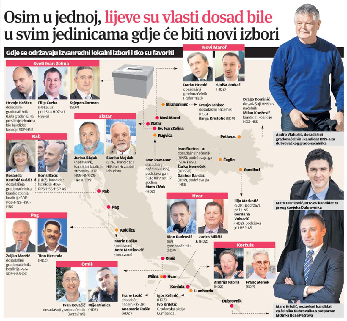 Građani 17 gradova i općina u kojima nije donesen proračun za ovu godinu ove će nedjelje na Dan žena na prijevremene lokalne izbore, a dvije najveće stranke – SDP i HDZ – tu će priliku iskoristiti kao svojevrsni test uoči parlamentarnih izbora. Dok HDZ iz te priče može izaći samo kao pobjednik budući da je samo jedan njihov gradonačelnik izgubio vlast zbog proračuna, vladajućima će ovi izbori biti iznimno važni kako bi vidjeli imaju li i dalje potporu na “svojim” područjima, posebice onima na moru. Zato su premijer Zoran Milanović i šef HDZ-a Tomislav Karamarko u utorak bili na Rabu, gdje će snage odmjeriti već provjereni ljudi najjačih stranaka – dosadašnja gradonačelnica SDP-ova Rosanda Krstinić Gušćić te Nikola Grgurić, kandidat velike koalicije HDZ-RPS-HSS-HSP AS.