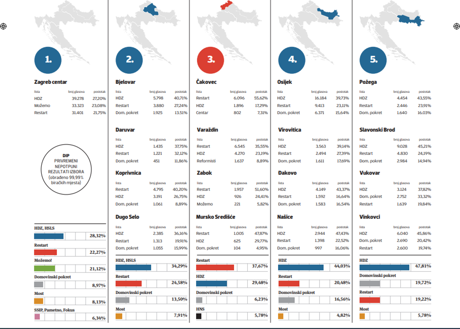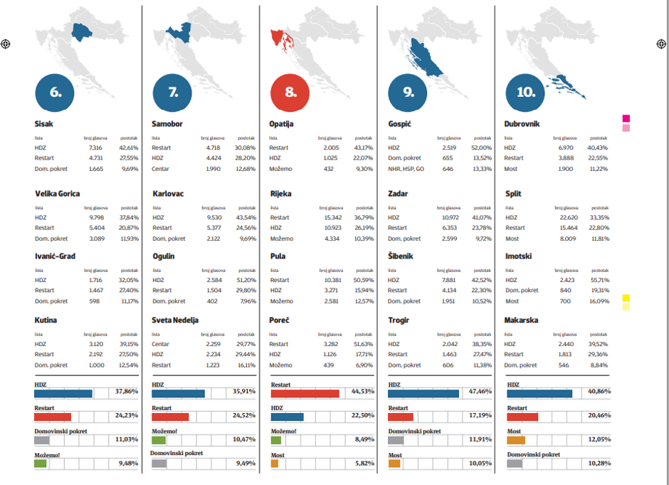 Karlovac i Ogulin povjerenje su dali HDZ-u, a Samobor je ostao vjeran Restart koaliciji i progurao je Krešu Beljaka u Sabor. Ivan Vilibor Sinčić u rodnom Karlovcu ostao je daleko ispod praga. U 8. izbornoj jedinici veliki gradovi poput Rijeke, Pule i Rovinja ostali su vjerni SDP-u i Restart koaliciji. U Zadru se Božidar Kalmeta, koji se nakon suđenja na kojem je nepravomoćno oslobođen, vratio u velikom stilu. Mato Franković je u samom Dubrovniku dobio više preferencijalnih glasova od nositelja liste Vilija Beroša.