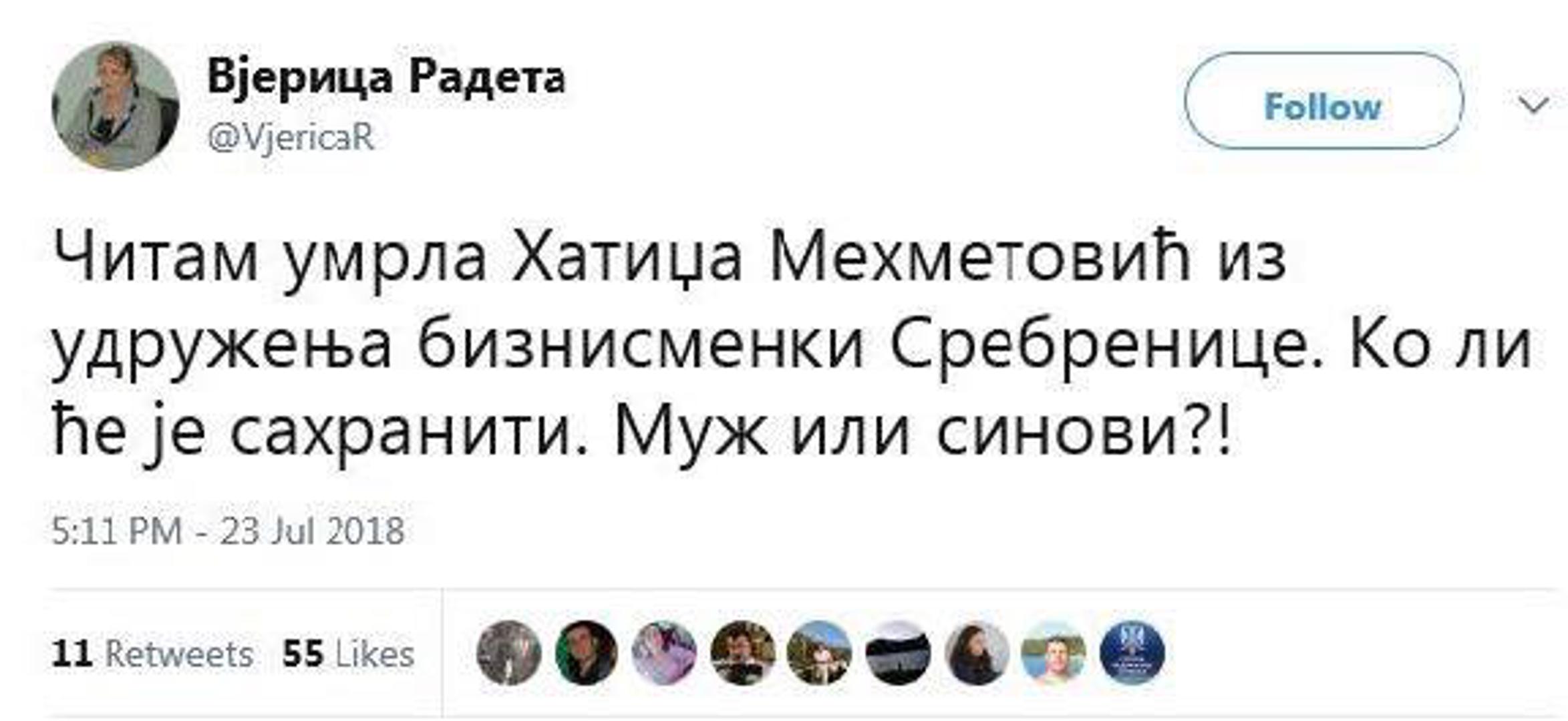 – Čitam umrla Hatidža Mehmedović iz udruženja poduzetnica Srebrenice. Tko li će je sahraniti. Muž ili sinovi? – napisala je ona na Twitteru.