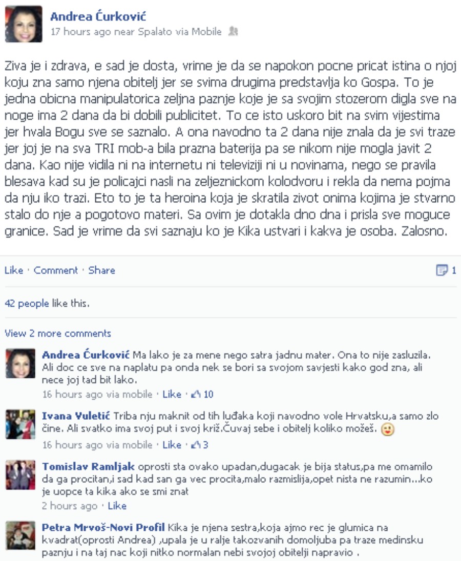 - To je jedna obična manipulatorica željna pažnje koja je sa svojim stožerom digla sve na noge ima dva dana da bi dobili publicitet, napisala je na Facebooku Kristinina sestra Andrea koja je najprije i bila prijavila njezin nestanak.