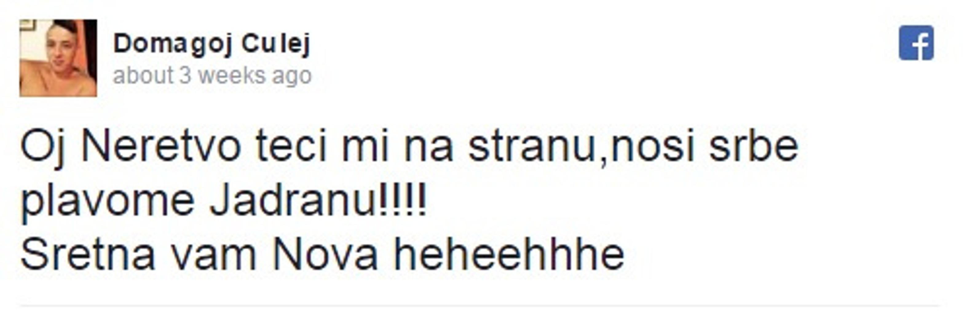 – Oj, Neretvo, teci mi na stranu, nosi Srbe plavome Jadranu! Sretna vam Nova hehe – napisao je na Facebooku prije tri tjedna.