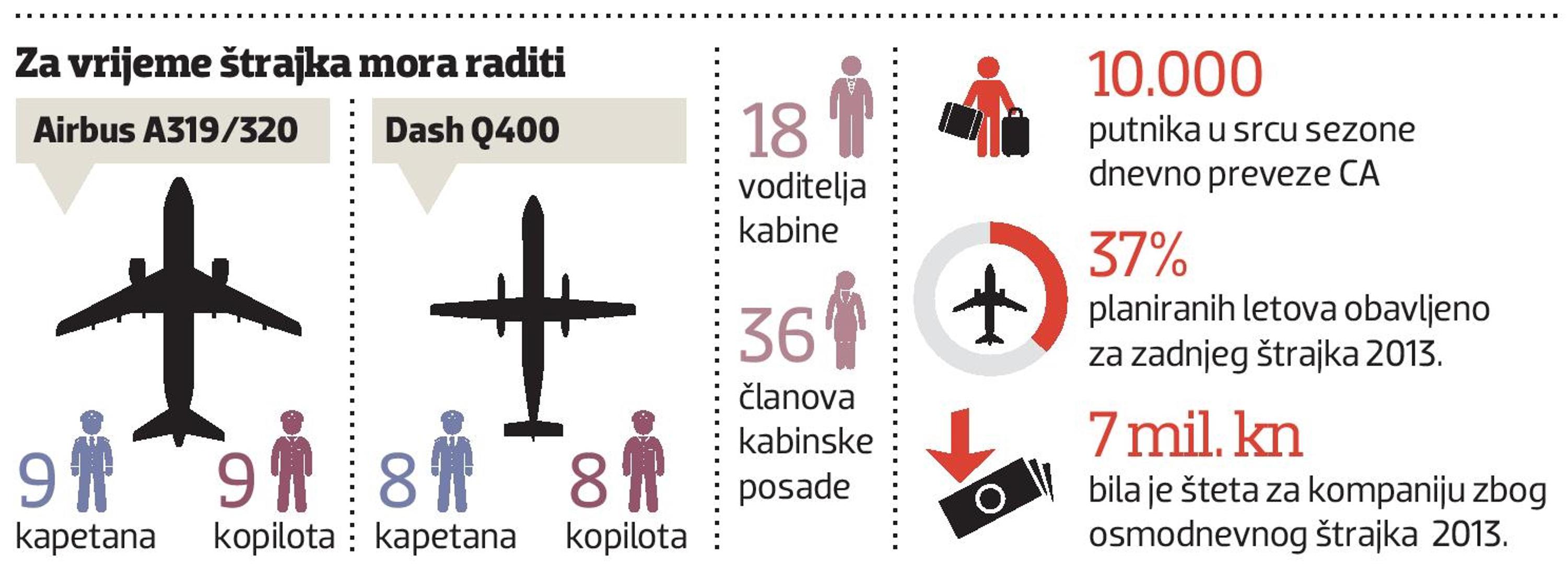 U slučaju štrajka usred turističke sezone, kad CA ima i do 100 letova dnevno i preveze u jednom danu 10.000 putnika, štrajk bi prema tvrdnjama Uprave donio kompaniji dnevne gubitke između 500 i 800 tisuća eura jer bi morali unajmiti zrakoplove drugih aviokompanija kako bi prevezli putnike koji su kupili karte kod Croatia Airlinesa.