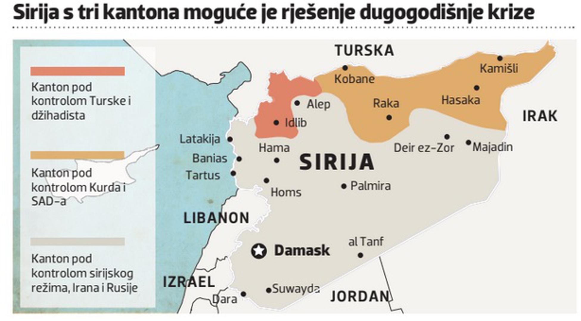 Isto tako, sjever Sirije, gdje žive Kurdi koji i kontroliraju to područje, koje je usto pod utjecajem SAD-a, Francuske i Velike Britanije, a gdje SAD i saveznici imaju i vojnu bazu, trebalo bi biti drugi kanton.