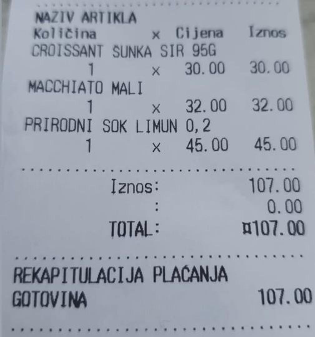 Točnije, croissant je platio 30 kuna, mali macchiato 32 kune, a limunadu 45 kuna.