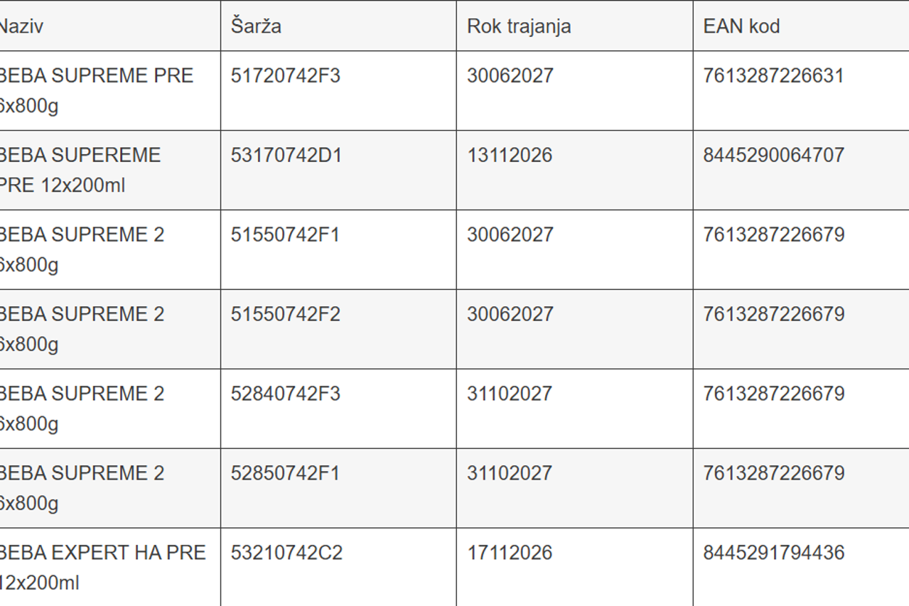 Od početka ove godine, Hrvatska agencija za poljoprivredu i hranu (HAPIH) objavila je niz obavijesti vezanih uz opoziva hrane za djecu i dojenčad. Između ostaloga, opozvan je dio Nestlé proizvoda iz kategorije BEBA pre, BEBA expert, BEBA comfort i BEBA supreme, kao i NAN formule za dojenčad. Zbog utvrđenog toksina bakterije Bacillus cereus (cerulida), opozvana je hrana Alfamino 400 g, serija 51200017Y2, rok valjanosti 30. 4. 2027., kao i hrana za dojenčad NAN Comfortis 1, LOT broja L-53260346AA, najbolje upotrijebiti do 30.11.2027. "Proizvodi nisu u skladu s Uredbom 178/2002 o utvrđivanju općih načela i uvjeta zakona o hrani, osnivanju Europske agencije za sigurnost hrane te utvrđivanju postupaka u područjima sigurnosti hrane", ističe HAPIH.
