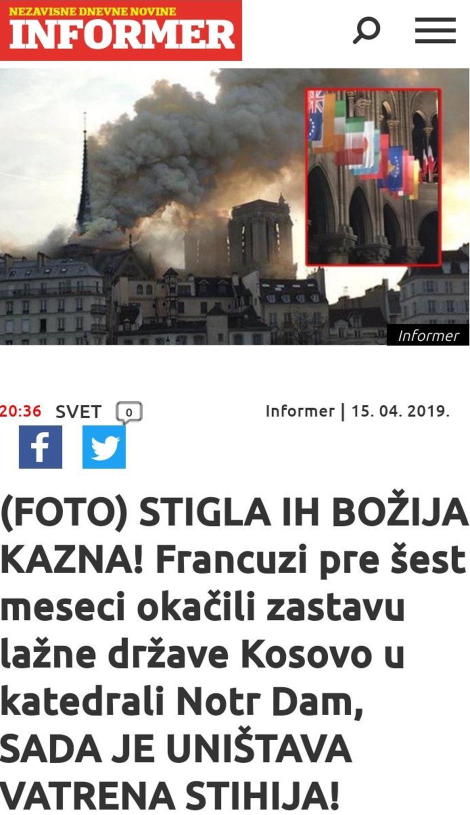 Skandalozna je bila i objava Informera koji je imao naslov: STIGLA IH BOŽIJA KAZNA! Francuzi pre šest meseci okačili zastavu lažne države Kosovo u katedrali Notr Dam, SADA JE UNIŠTAVA VATRENA STIHIJA!