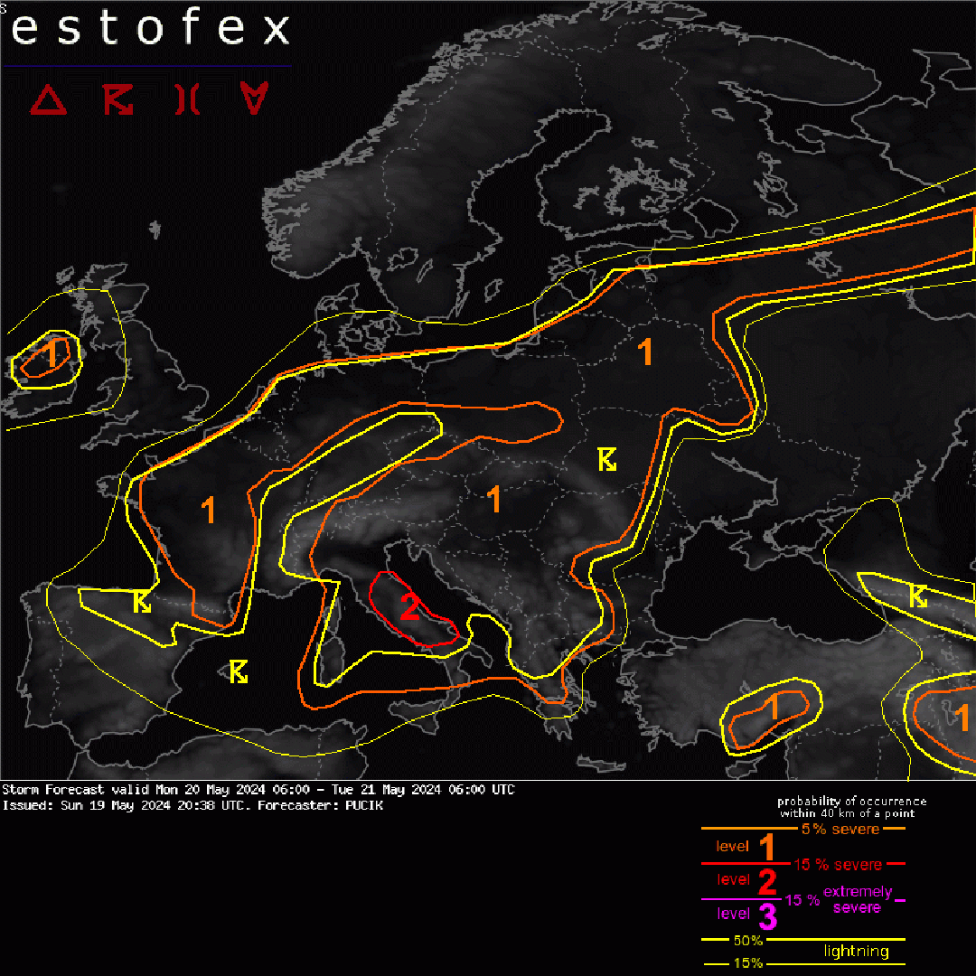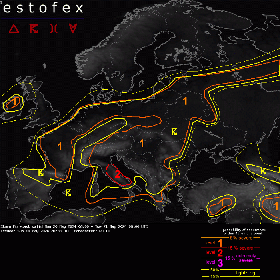 Međutim, nije jedino Hrvatska na udaru nevremena. Prema Estofexu, veći dio Europe mogao bi doživjeti oluju, a razina prijetnje podignuta je na 2 od moguće 3 u centralnoj Italiji, gdje bi mogla pasti obilna kiša te tuča, a najavljuju se i tornada. U ostatku Europe razina prijetnje je na 1. Dok se većinom svugdje očekuje obilna kiša, upozorenje je za Hrvatsku, kao i okolne države, izdano i zbog moguće tuče te jakog vjetra.