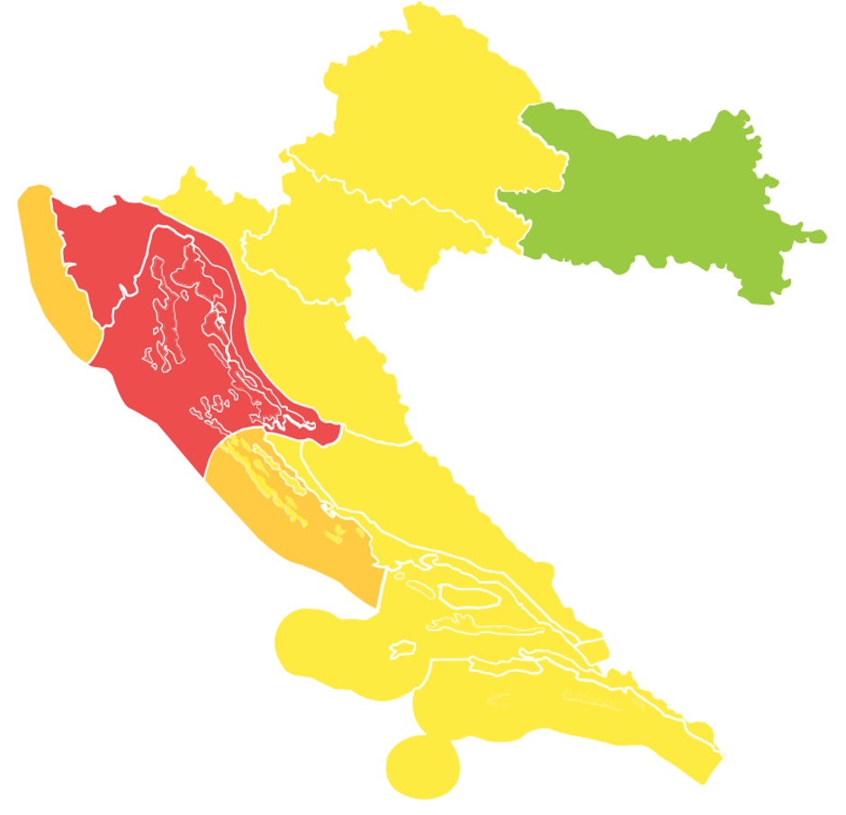 Gotovo cijela Hrvatska danas se probudila pod meteoalarmima DHMZ-a, a najgore je na Kvarneru te na području Velebitskog kanala gdje se očekuje vjetar s udarima i do čak 180 km/h te je na snazi crveno upozorenje. Ostatak Hrvatske je u žutom, i to zbog vjetra i snijega, dok je u narančastom još i Sjeverna Dalmacija. Sutra će i istok Hrvatske biti pod alarmom te se i na tom području očekuje snijeg.
