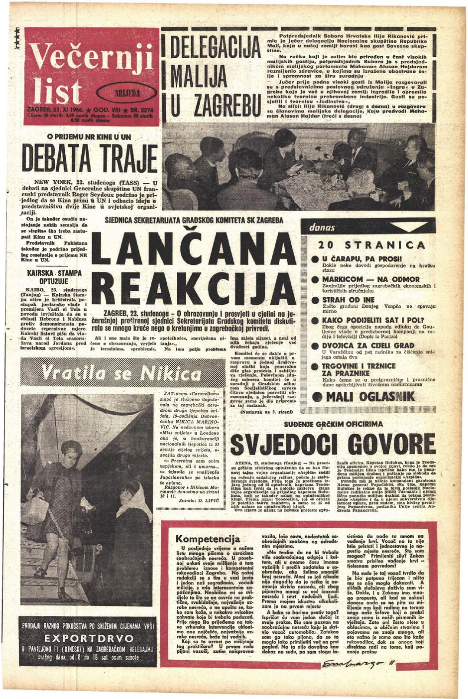 Bez mnogo fleševa i pompe, bez spektakala i reflektora, sinoć je sasvim neprimjetno na zagrebački aerodrom sletjela službeno "najljepša djevojka Jugoslavije" i odnedavno vice "Miss svijeta" – 19-godišnja Dubrovčanka Nikica Marinović. Došla je s titulom "druge ljepotice svijeta", s mnogo komplimenata, poziva, ponuda... Nakon Londona, gdje je u konkurenciji pedeset i jedne nacionalne "miss" odnijela drugo mjesto, bila je u Parizu tri dana gost dnevnika "France soir"...