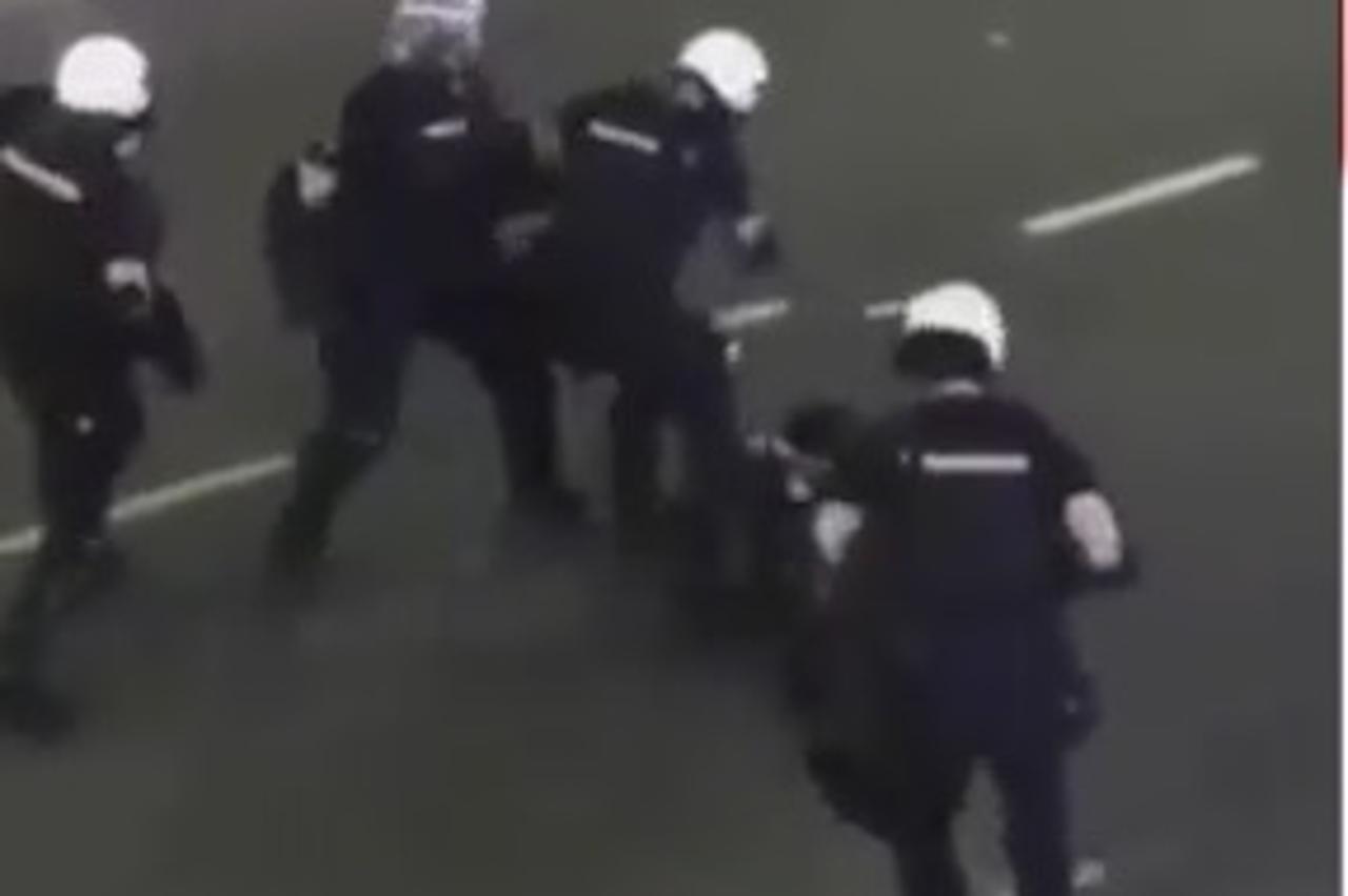 Društvenim mrežama širi se šokantna snimka iz Srbije nastala tijekom večerašnjih prosvjeda, a u kojoj se vidi kako policajci brutalno tuku jednog prosvjednika koji sklupčano leži na cesti.