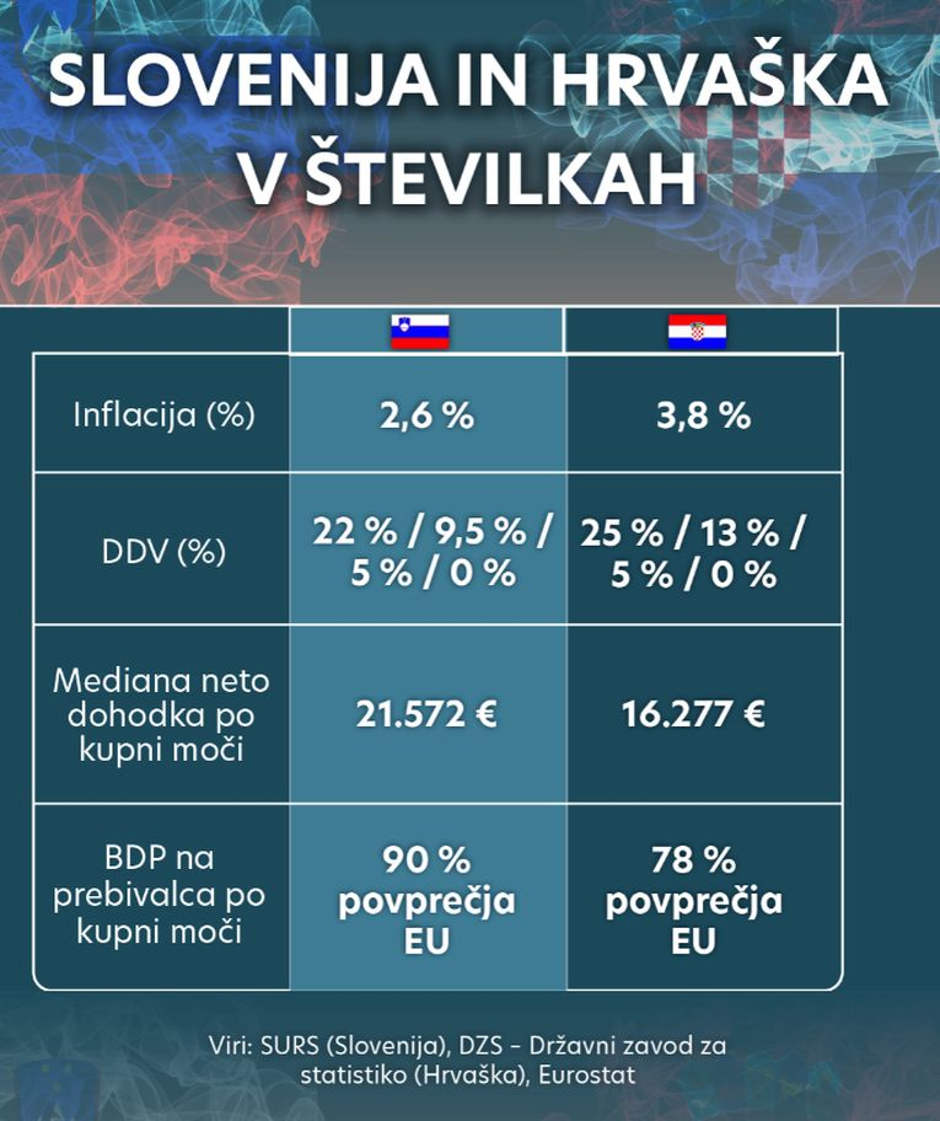 Dotaknuli su se i inflacije koja je u Sloveniji bila 2,6 a u Hrvatskoj 3,8%. Njihove stope PDV-a su 22%/9,5%/5%/0$, a u Hrvatskoj 25%/13%/5%/0%. Uspoređuju i BDP po stanovniku prema paritetu kupovne moći. On u Sloveniji doseže 90% prosjeka EU dok je Hrvatska na 78% prosjeka EU.