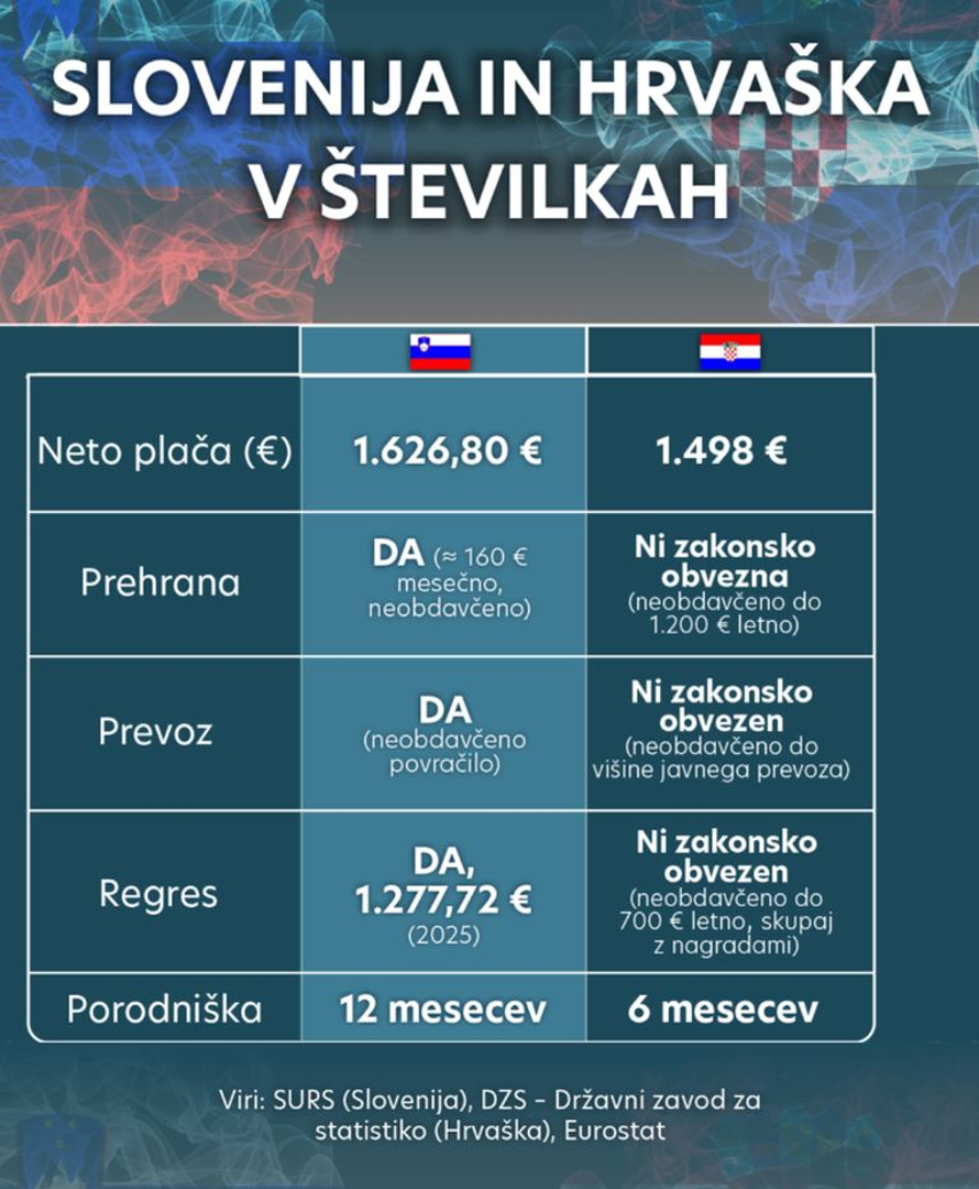 Slovenska vlada sada u objavi na TikToku navodi kako je njihova neto plaća 1626,80 eura, a u Hrvatskoj 1498 eura. Njihovi radnici primaju i 160 eura mjesečno za prehranu, neoporezivo. Navode kako prehrana nije zakonski obavezna (1200 eura je neoporezivo). Zakonska obaveza je i za prijevoz radnika, također neoporezivo dok u Hrvatskoj nije zakonski obavezan. Navode i kako radnici u Sloveniji primaju i regres u iznosu od 1277,72 eura dok to u Hrvatskoj nije obavezno isplatiti. Usporedba je i u porodiljnoj naknadi. Objavili su kako ona kod njih traje 12 mjeseci, a u Hrvatskoj šest.