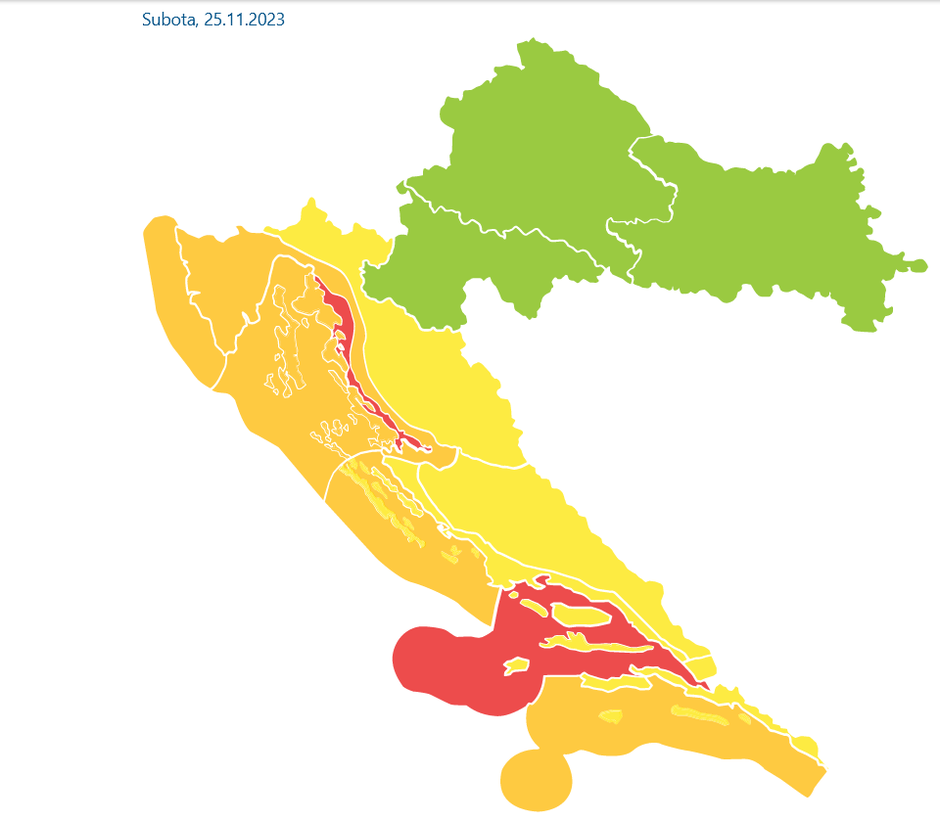 Državni hidrometeorološki zavod najavio je za subotu većinom oblačno s mjestimičnim oborinama, dok će u gorju biti snijega. Isto tako, navode kako bi snijeg mogao pasti i u nekim nizinama. Za područje Velebitskog kanala i Srednje Dalmacije su izdali crveno upozorenje.