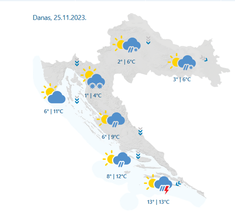- Ujutro i dio prijepodneva većinom oblačno s mjestimičnim oborinama, kišom, u gorju snijegom, a malo susnježice ili snijega može pasti i u nekim nizinama. Potom prestanak oborine i smanjenje naoblake. Sjeveroistočnjak kojeg već ima u gorju zapuhat će i u nizinama, a bit će većinom umjeren, u višim predjelima jak i vrlo jak - navodi Državni hidrometeorološki zavod u prognozi za subotu.