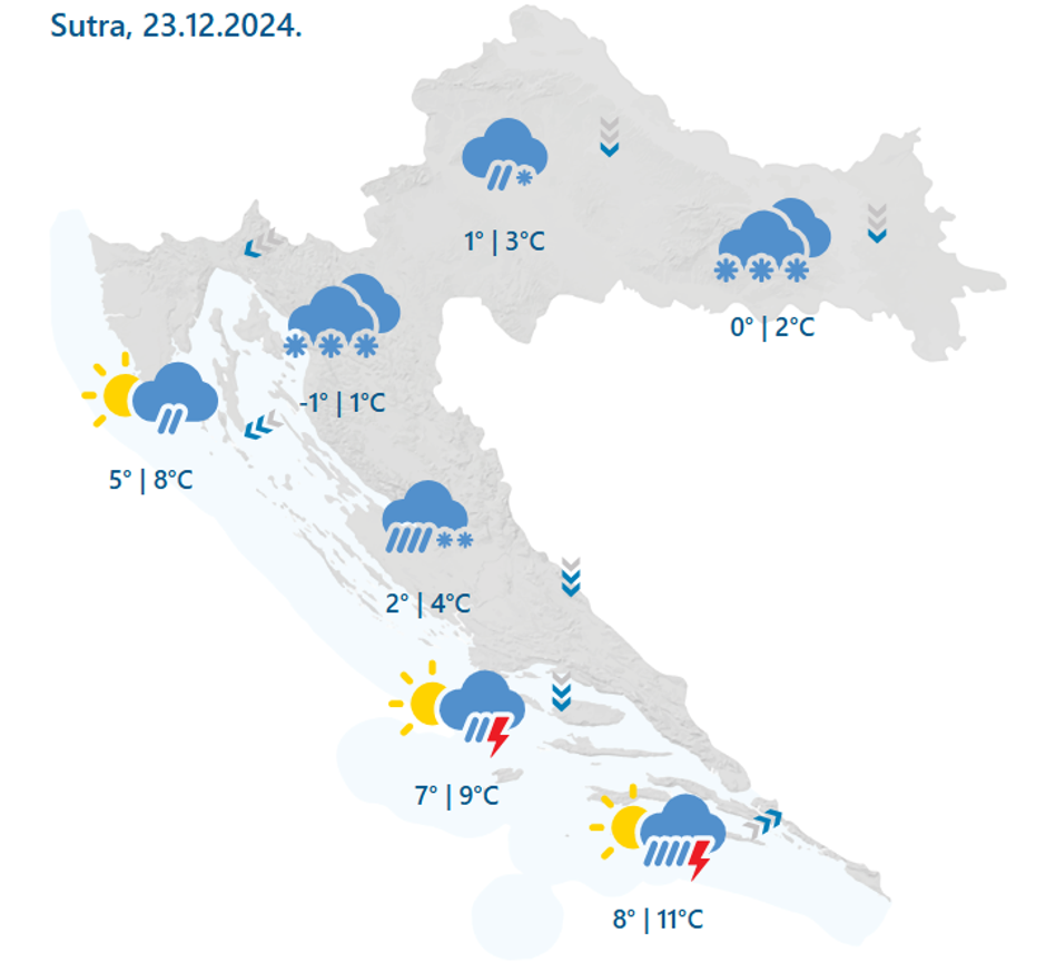 Na obali su mogući obilni pljuskovi, grmljavina pa i tuča, a u unutrašnjosti bi mogla pasti pokoja pahulja ili susnježica, priopćili su iz DHMZ-a. Snijeg nošen jakim vjetrom se može očekivati i na obali, a temperature će biti između 6 i 11 °C, a u unutrašnjosti od 2 do 5 °C. Na jugu Hrvatske u noći i ujutro jako i olujno jugo i jugozapadnjak, zatim okreće na buru, pa će i more biti valovito. Najavljuje se i kiša, ponegdje obilni pljuskovi s grmljavinom pa i tučom. U unutrašnjosti je moguć i snijeg, osobito u Konavlima blizu granice.