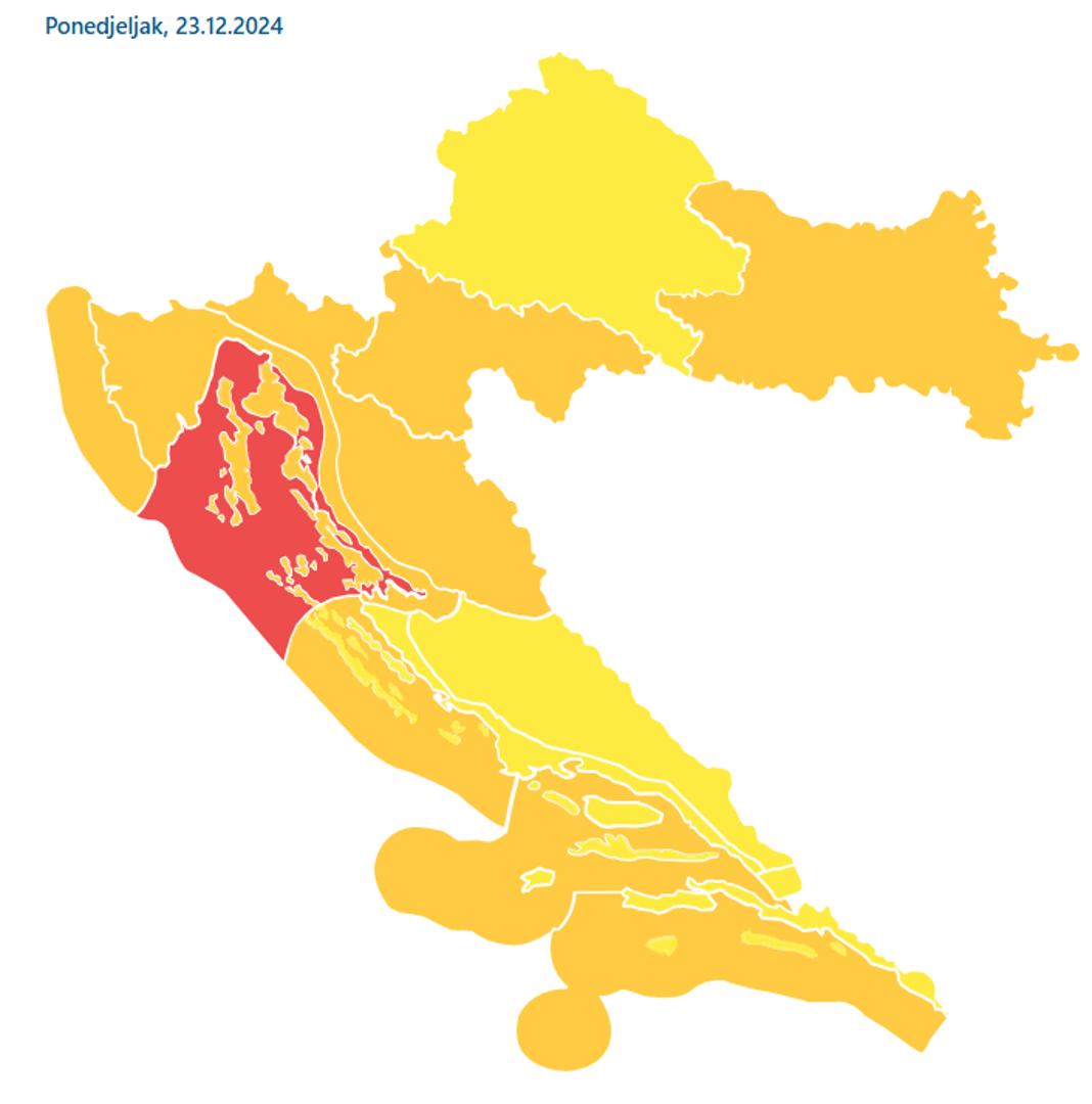 Nadalje, izdana su crvena i narančasta upozorenja. Prema DHMZ-u, izrazito opasno vrijeme može se očekivati na Kvarneru i Kvarneriću te na Velebitskom kanalu. Savjetuju građane da izbjegavaju putovanja i boravak blizu ugroženih obalnih područja te ističu kako trajekti vrlo vjerojatno neće ploviti. Narančasto upozorenje izdano je za Osječku regiju, Karlovačku regiju, Gospićku i Riječku regiju, Zapadnu obalu Istre, Sjevernu, Srednju i Južnu Dalmaciju. Dok je za Zagrebačku regiju, Kninsku, Splitsku i Dubrovačku regiju izdano narančasto upozorenje.