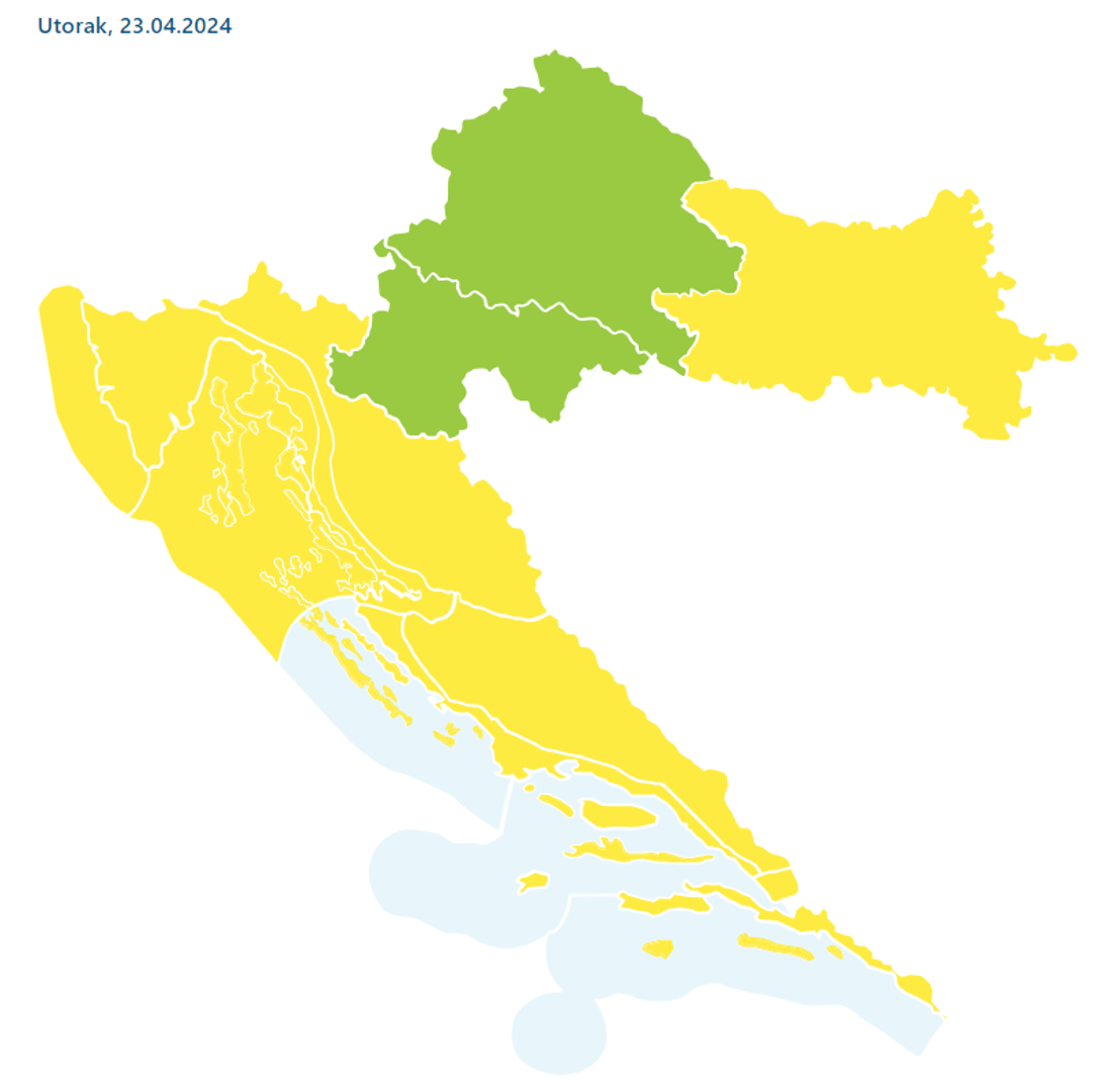 DHMZ je za srijedu izdao i nekoliko žutih upozorenja koja vrijeme opisuju kao potencijalno opasno. Grmljavinsko nevrijeme moguće je u osječkoj, splitskoj, kninskoj i dubrovačkoj regiji.