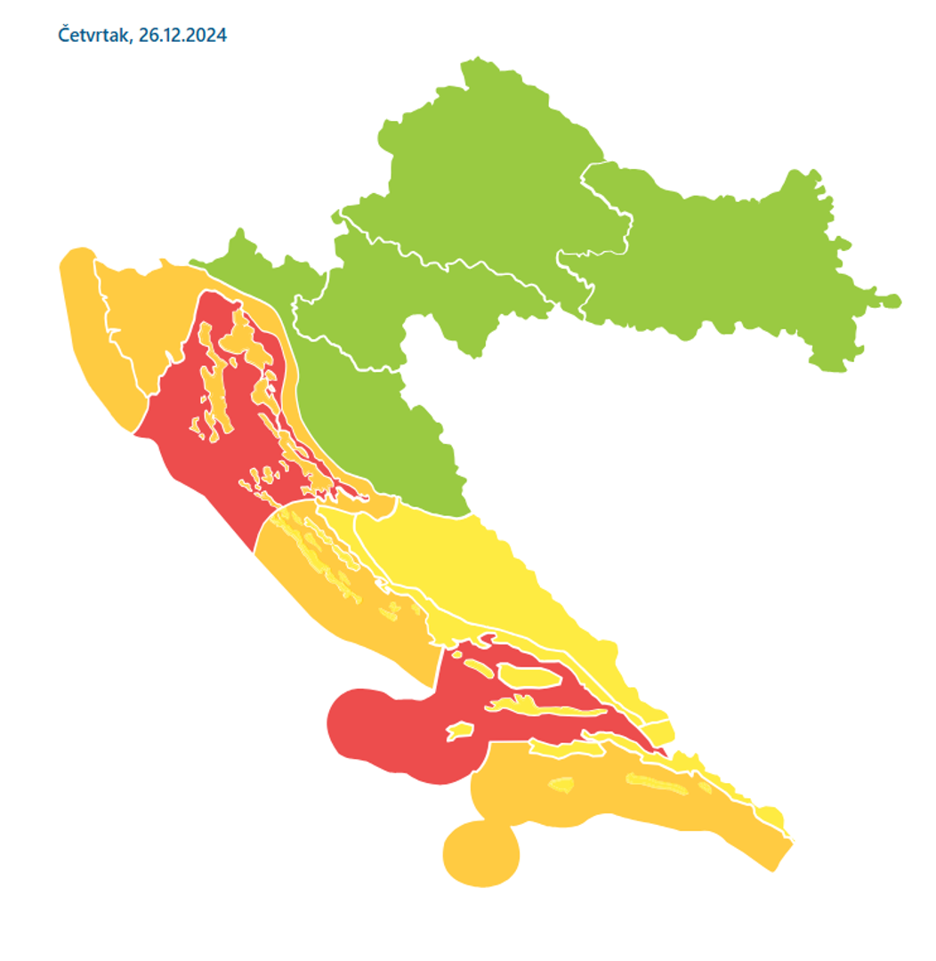 Crveni meteoalarm koji označava izuzetno opasno vrijeme na snazi je za Kvarner, Velebitski kanal i područje Srednje Dalmacije. Meteorolozi upozoravaju na jaku buru s orkanskim udarima koji će prema večeri postupno slabjeti. Najjači udari bure mogu doseći brzinu do 185 kilometara na sat.