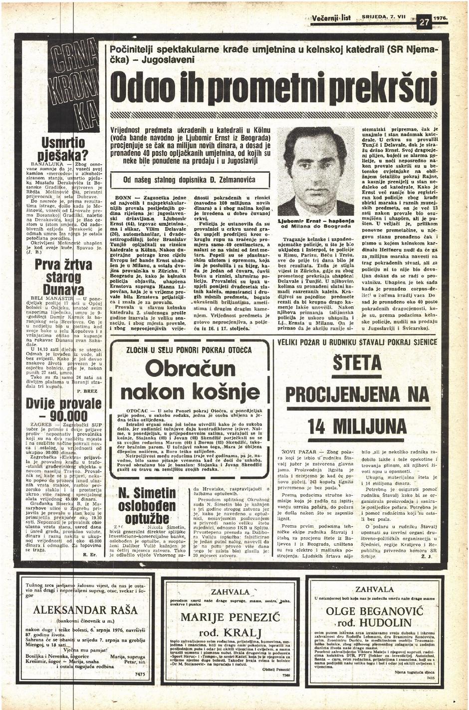 Tek početkom srpnja, 1976. godine, počeli su se i to sasvim slučajno slagati kamenčići mozaika misteriozne pljačke katedrale u Kölnu, u kojoj su ukradeni predmeti od neprocjenjive vrijednosti. Osim njemačke policije, kojoj se, u potrazi za pljačkašima, odmah pridružio i Interpol, na noge se digla i policija u Rimu, Parizu, Beču i Trstu. Nakon punih osam mjeseci 'tapkanja u mraku', zagonetka, jedne od najvećih i najspektakularnijih pljački, do tada, konačno je riješena, a počinitelji su uhićeni. U Večernjakovoj arhivi pronašli smo članke kako se pisalo o toj pljački.