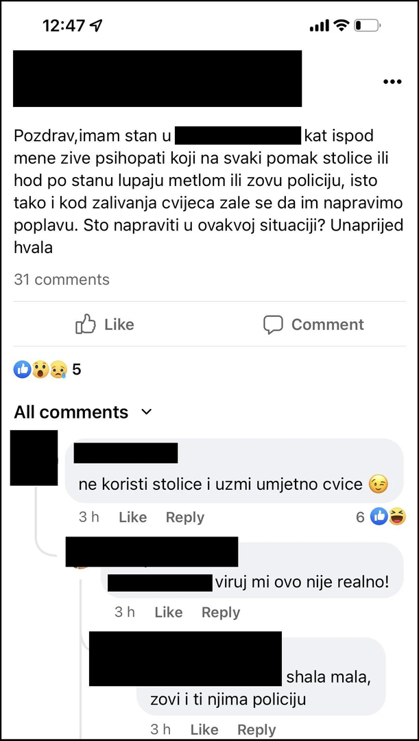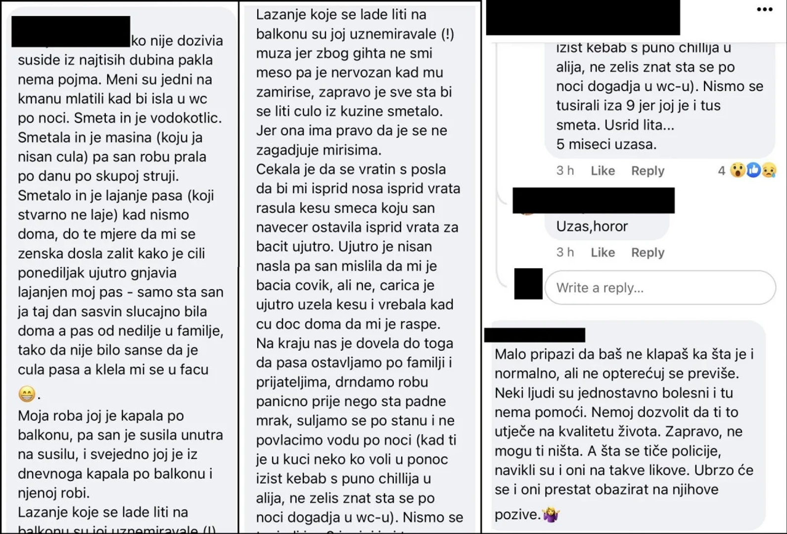 Na kraju nas je dovela do toga da pasa ostavljamo po familji i prijateljima, drndamo robu panično prije nego šta padne mrak, šuljamo se po stanu i ne povlačimo vodu po noći... Nismo se tuširali iza 9 jer joj je i tuš smeta. Usrid lita... 5 miseci užasa", napisala je ta žena.