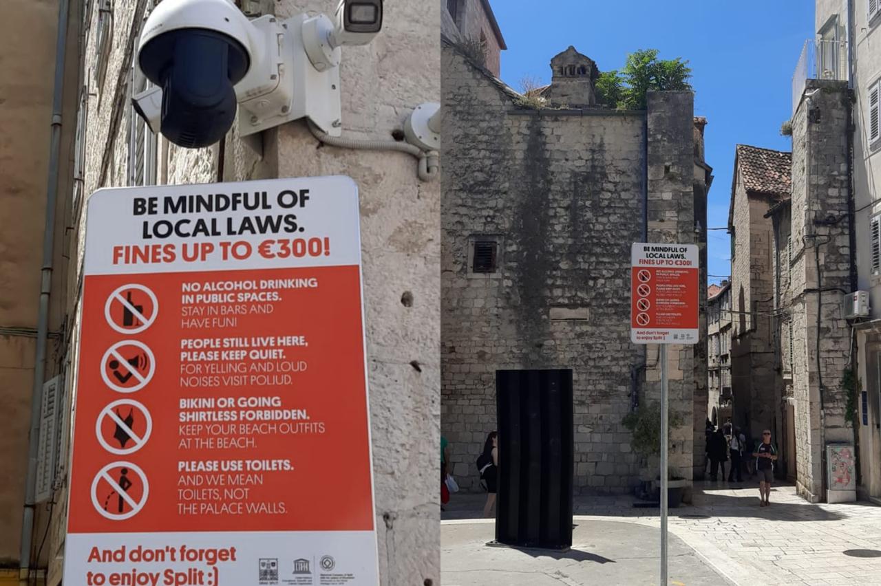 Na tablama tako piše da je zabranjeno konzumiranje alkohola na javnim mjestima te hodanje gradom u bikinijima ili bez majice. Upozoravaju turiste da ljudi žive u gradu te da budu tihi, a da je galama dozvoljena na Poljudu. Na kraju mole da se koriste zahodi za obavljanje nužde, a ne gradske zidove. Na svakoj tabli stoji i upozorenje da su kazne do 300 eura za one koji ne poštuju pravila.