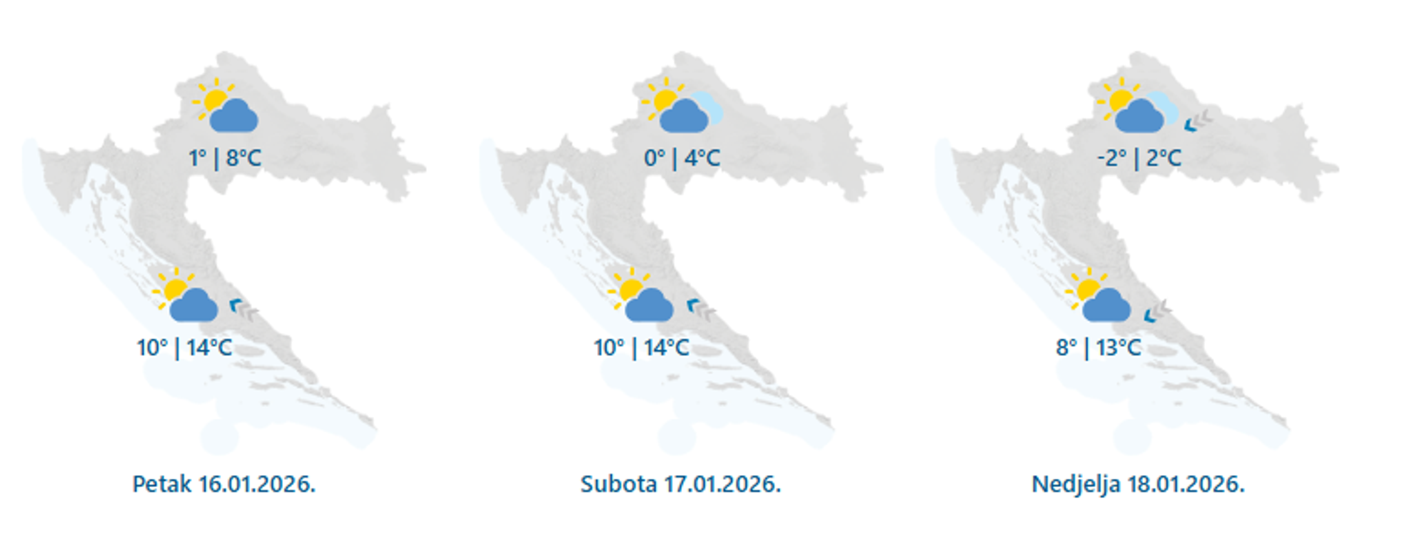 Kako navodi Državni hidrometeorološki zavod (DHMZ), danas će na Jadranu i predjelima uz njega biti promjenjivo, ponegdje i pretežno oblačno. Lokalno se očekuje i malo kiše, uglavnom u Gorskoj Hrvatskoj i na sjevernom Jadranu. Sunčanije će biti u središnjim i istočnim krajevima, dok je ujutro te ponovno navečer ponegdje moguća magla. Vjetar će biti slab do umjeren jugozapadni, u gorju s jakim udarima, a na Jadranu većinom umjeren istočni i jugo. Najviša dnevna temperatura zraka bit će većinom između 8 i 13 °C, a na obali i otocima između 11 i 16 °C. Za osječku, zagrebačku i karlovačku regiju izdana su upozorenja zbog ponovnog smrzavanja ugaženog i otopljenog snijega te poledice.