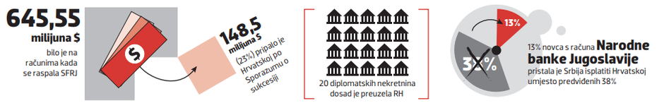 Kad se Jugoslavija raspala, na deviznim računima bilo je 645,55 milijuna američkih dolara, od čega Hrvatskoj po sporazumu o sukcesiji pripada 23 posto, odnosno 148,5 milijuna dolara. No kad se trebalo početi razgovarati o podjeli, Srbija je ostale zemlje obavijestila da je na računima samo 56 milijuna dolara, odbijajući dati objašnjenje gdje je novac. No Hrvatska ima dokaze da se zajednički novac – oko 690 milijuna dolara – tijekom 90-ih koristio za podmirivanje dugova koje su srbijanske tvrtke imale u inozemstvu te da je Srbija posebno instruirala spomenute banke da se ne koristi za druge bivše republike.