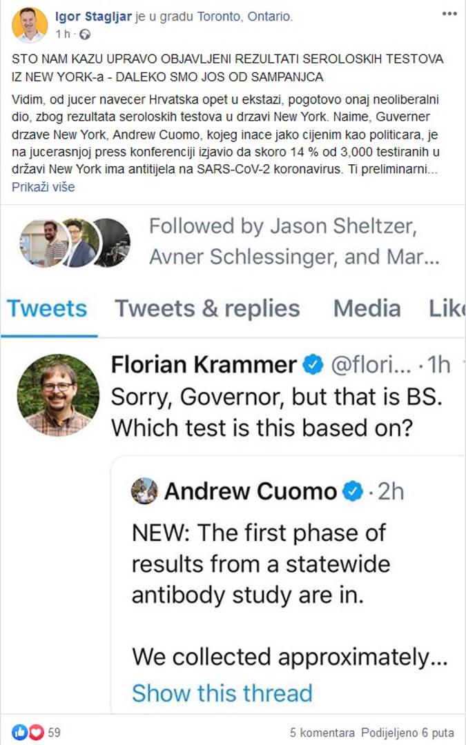 – Kao prvo, mislim da nije dobro da rezultate tako važnih istraživanja prezentira jedan političar – ovdje se radi o čistoj znanosti, a nju trebaju komunicirati istinski stručnjaci. Jedan od njih je moj kolega profesor Florian Krammer s Mount Sinai Bolnice u New Yorku čija je grupa nedavno razvila prvi serološki (krvni) test koji je u stanju detektirati antitijela direktno u krvi ljudi, te nam tako dati do znanja je li već dotična osoba bila u kontaktu s virusom. Važno je spomenuti da je taj serološki test, razvijen u grupi Profesora Krammera, prije 7 dana odobrio američki FDA. Taj isti Profesor Kramer je jučer, samo nekoliko minuta nakon sto je Guverner Cuomo prezentirao gore-navedene podatke o serološkim testovima u New Yorku, izbacio jedan jako neugodan tweet (vidi attachment) sa sljedećim sadržajem” “Oprostite Guverneru, ali to je sra_e. Na kojem testu se baziraju Vaši podaci”?