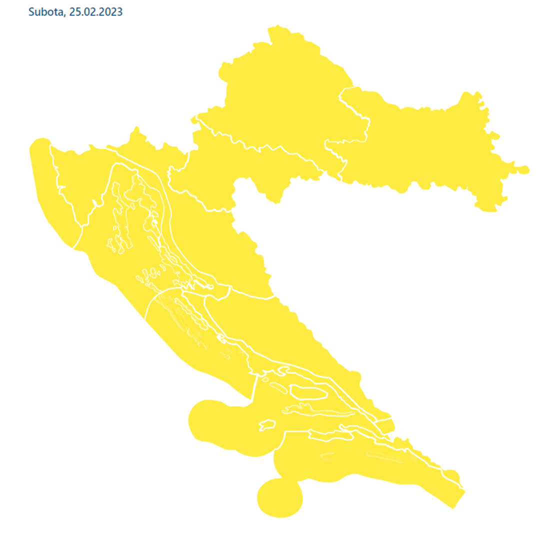 Žuti Meteoalarm upaljen je za subotu na području cijele Hrvatske, i to poglavito zbog kiše te vjetra koji bi mjestimično mogao doseći brzinu i do 85 km/h. Nešto gora situacija očekuje se pak u nedjelju, kada je za područje Istre, Kvarnera te sjeverne Dalmacije upaljen crveni Meteoalarm zbog jakog vjetra brzine i do 150 km/h.