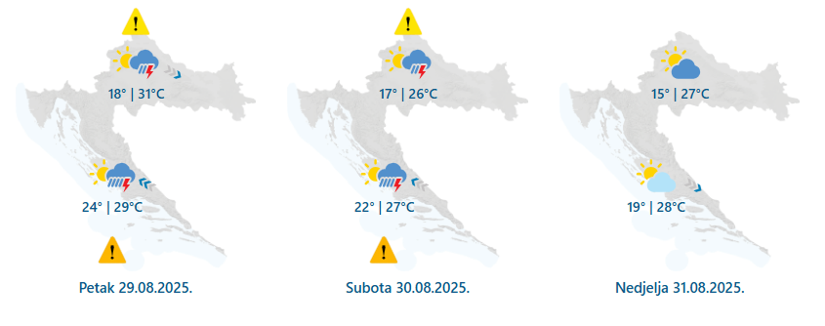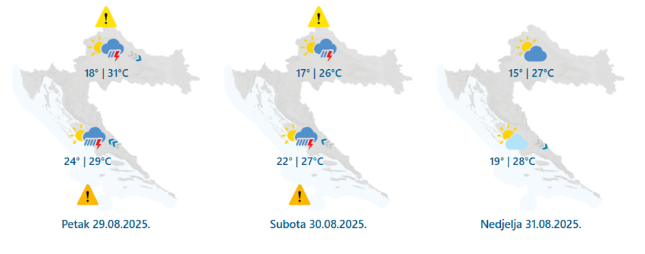 Kako navodi DHMZ, u petak sa zapada stiže postupno naoblačenje s kišom i izraženijim pljuskovima s grmljavinom, najprije na sjevernom Jadranu, zatim u Gorskoj Hrvatskoj, od sredine dana i drugdje. Moguće je grmljavinsko nevrijeme, ponajprije na Jadranu. U subotu promjenjivo oblačno, u većini krajeva povremeno kiša i pljuskovi s grmljavinom, lokalno i izraženiji. U nedjelju će biti sunčanije, osobito na Jadranu, dok u unutrašnjosti može biti ponekog pljuska.
