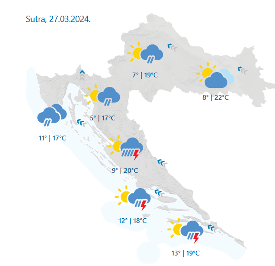 "Promjenjivo oblačno sa sunčanim razdobljima. Na Jadranu i u krajevima uz njega mjestimice kiša, češća u drugom dijelu dana kada su mogući i obilniji pljuskovi s grmljavinom. Prema večeri se kiša očekuje i u središnjim krajevima, a tek krajem dana i u istočnim. Vjetar slab do umjeren jugoistočni i južni, ponegdje na udare i jak, navečer u okretanju na jugozapadni. Na Jadranu jako i olujno jugo, prema večeri ponajprije na sjevernom dijelu okreće na jugozapadnjak i sjeverozapadnjak. Najniža jutarnja temperatura zraka između 4 i 9, na Jadranu od 10 do 14 °C. Najviša dnevna većinom između 17 i 22 °C", navode.