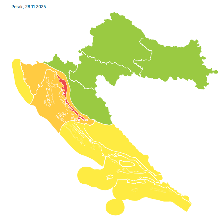 U petak nas u Slavoniji, Baranji i Srijemu očekuje većinom oblačno vrijeme, mjestimice uz malo kiše, susnježice i snijega. Vjetar će biti povremeno umjeren sjeverni i sjeverozapadni. Jutarnje temperature kretat će se od 0 do 2 °C, a najviše dnevne dosegnut će 3 do 5 °C, prognozirao je za HRT meteorolog DHMZ-a mr. sc. Dragoslav Dragojlović. U središnjoj Hrvatskoj bit će slične dnevne temperature, uz nešto niže jutarnje vrijednosti. Naoblaka će biti promjenjiva, s povremenim sunčanim razdobljima, a vjetar većinom slab. Na sjevernom Jadranu djelomice sunčano, uz promjenjivu naoblaku, dok će u Gorskoj Hrvatskoj biti većinom oblačno, uz povremenu susnježicu i snijeg. "Puhat će jaka i olujna bura, podno Velebita i s udarima orkanske jačine, koja će prema kraju dana postupno slabiti", upozorio je Dragojlović. Jutarnja temperatura zraka kretat će se od -3 do 0 °C, a na obali od 3 do 6 °C. Najviše dnevne vrijednosti između 0 i 3 °C, na moru od 9 do 11 °C. DHMZ je izdao i upozorenje zbog nadolazeće jake olujne bure podno Velebita.