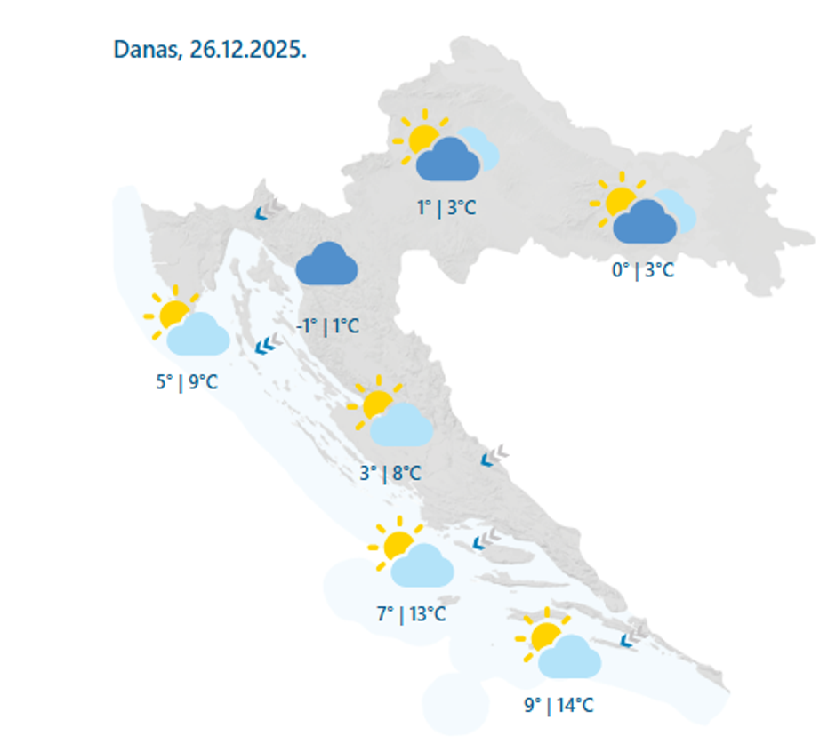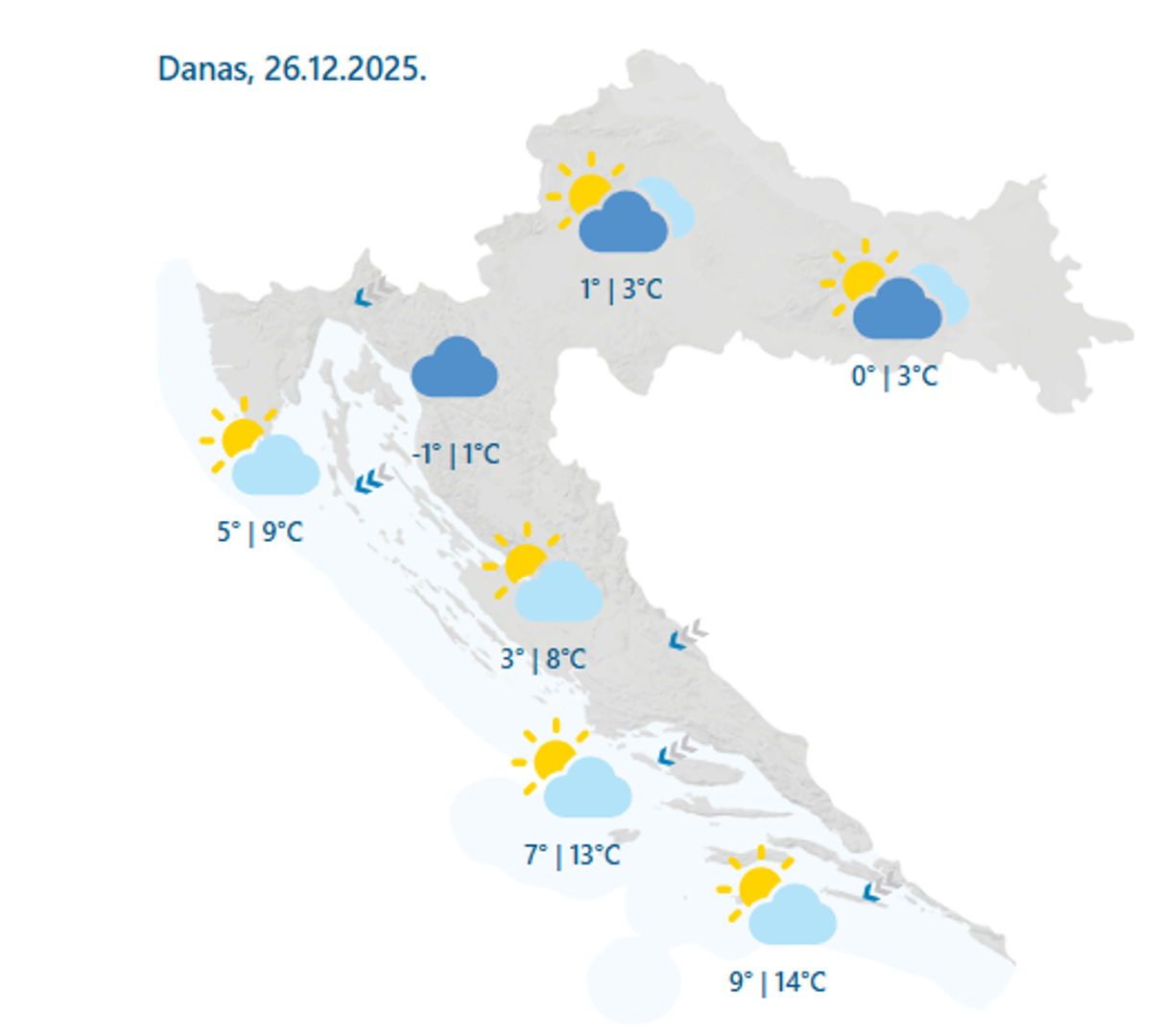 Unatoč burnom početku blagdanskog razdoblja, danas, na blagdan svetog Stjepana, postupno će jačati utjecaj anticiklone, što će donijeti smirivanje vremena u većem dijelu Hrvatske. Oborine će prestati, a slijedi i razvedravanje, dok će se više oblaka zadržavati još ponegdje u Gorskoj Hrvatskoj. Bura će na obali postupno slabjeti, što je uvod u stabilniji i mirniji vikend, osobito na Jadranu, dok će u unutrašnjosti i dalje biti hladno uz čestu jutarnju maglu. Na Jadranu, kao i u unutrašnjosti Istre i Dalmacije, prevladavat će pretežno sunčano vrijeme. U ostatku unutrašnjosti bit će više oblaka, osobito u jutarnjim satima kada je još lokalno moguća slaba oborina. Prema večeri i tijekom noći očekuje se postupno smanjenje naoblake.