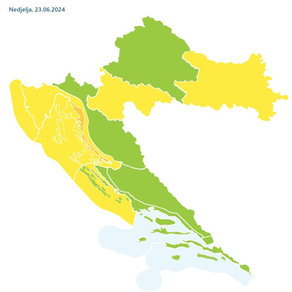 U dijelovima zemlje upaljeno je i žuto upozorenje meteoalarma. Na području Karlovca i na istoku zemlje očekuje se grmljavinsko nevrijeme, dok će na sjevernom Jadranu i u Istri puhati jak vjetar. Za Velebitski kanal pak je izdano narančasto upozorenje zbog vjetra, s udarima od 65 do 110 km/h.