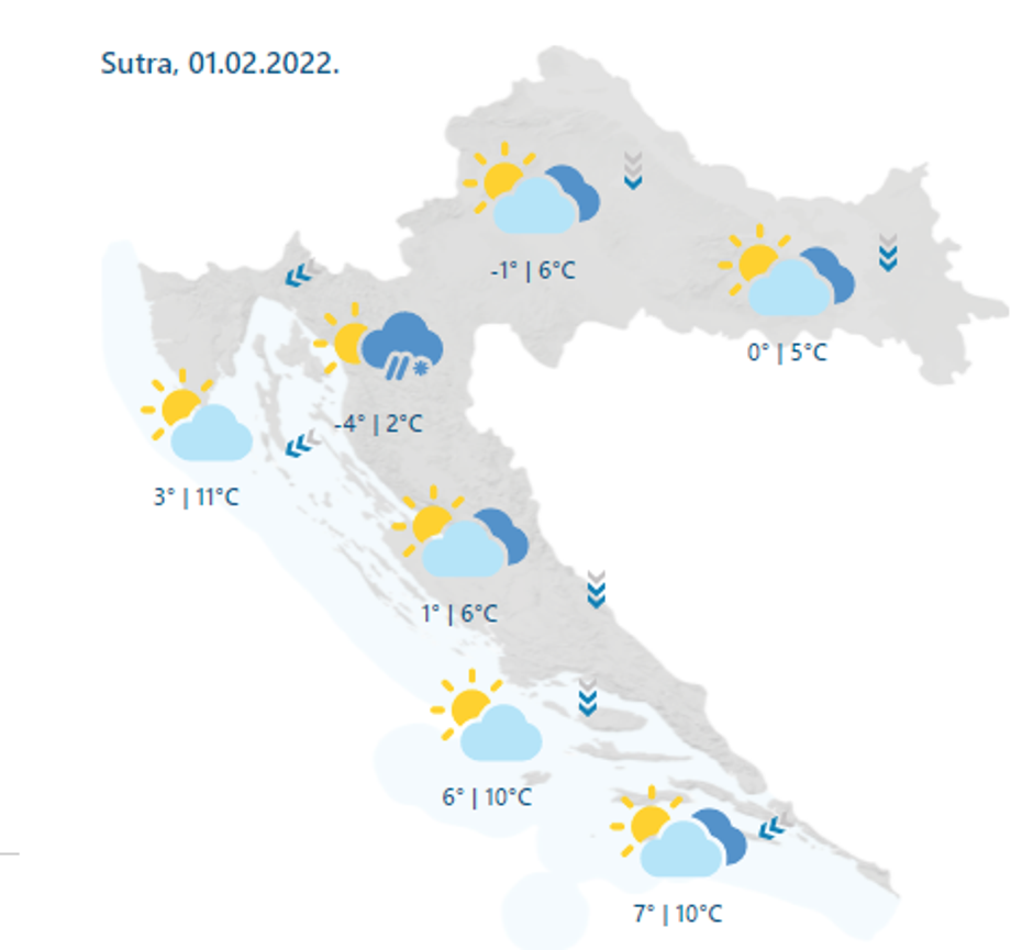 - U Dalmaciji jugo, promjenjiva naoblaka u drugom dijelu dana i kiša, no navečer i u noći, uz granicu s Bosnom i Hercegovinom moguć je i snijeg. Na krajnjem jugu Hrvatske sunčana su razdoblja najvjerojatnija, osobito prijepodne, zatim naoblačenje i kiša. Zapuhat će umjereno jugo te postupno jačati pa će more biti malo do umjereno valovito - napominje meteorologinja.